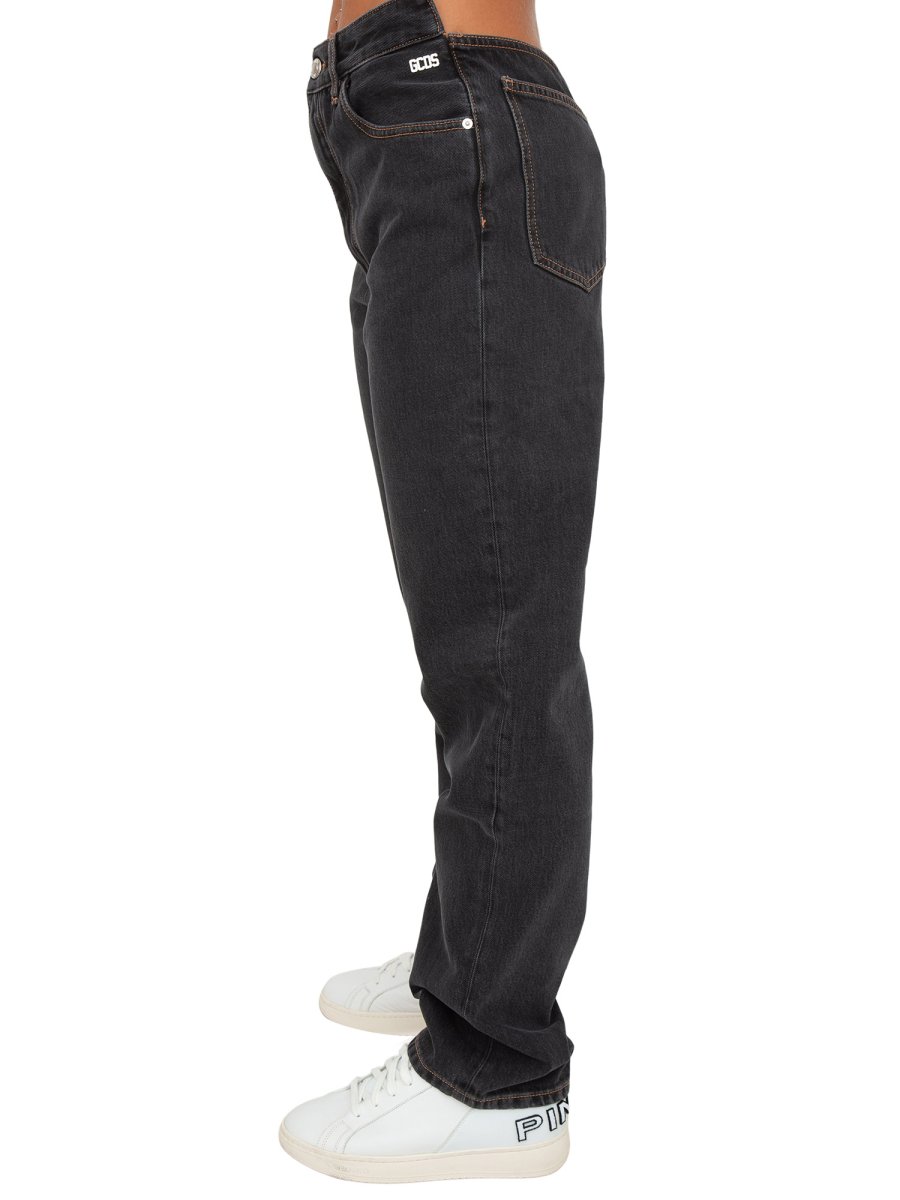Jeans GCDS a vita media in denim con lavaggio stonewashed bleached. Impunture a contrasto color tabacco. Dietro, in vita, choker logo GCDS con strass. Vestibilità straight.