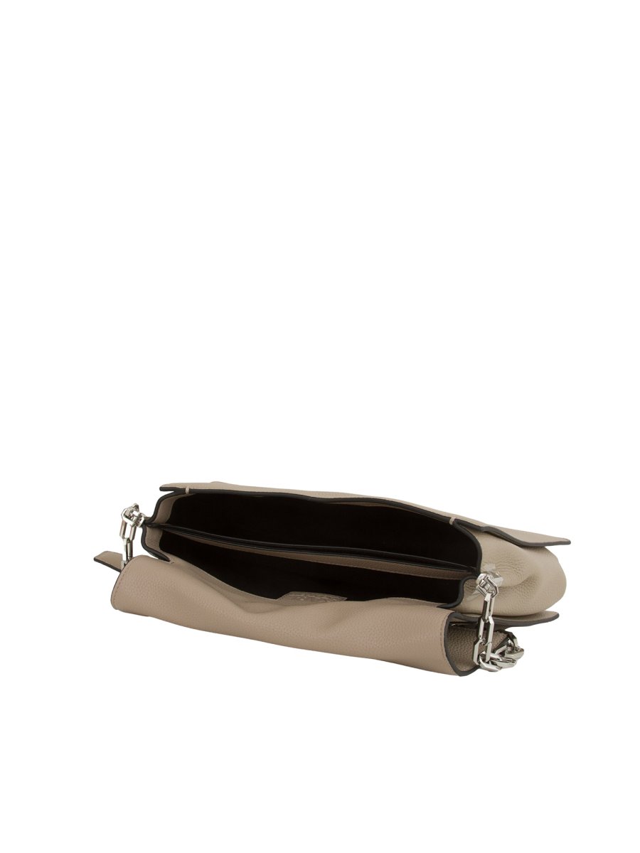 Borsa a spalla karl Lagerfeld realizzata in morbida pelle testurizzata con linea strutturata, chiusura con patta, tracolla in pelle e a catena e dettagli a catena e logo KARL. Altezza: 19 cm Lunghezza: 35 cm Larghezza: 8 cm.