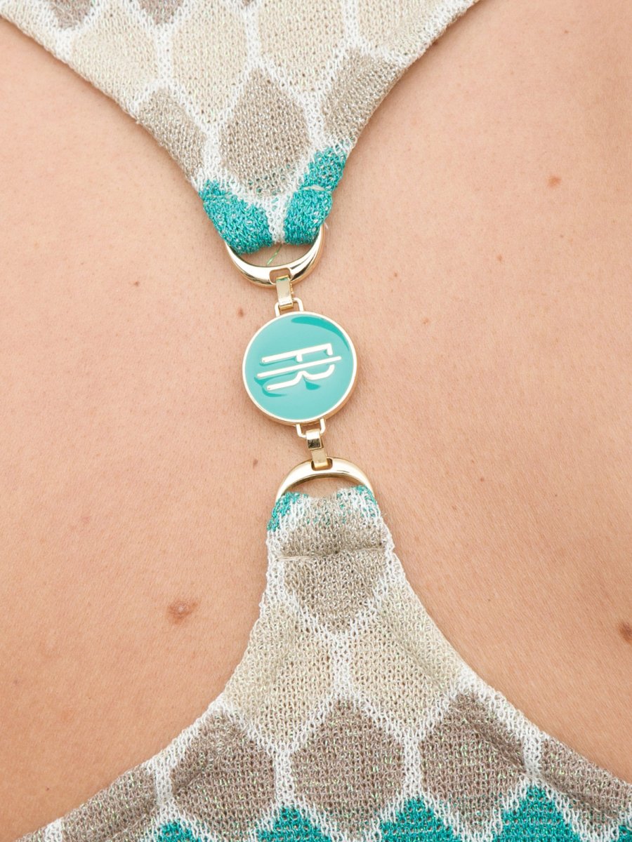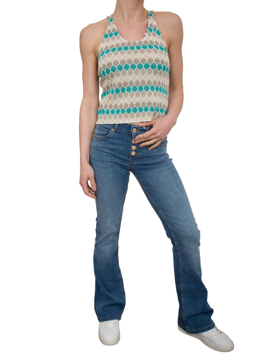 Майка без рукавов из жаккардового узора с геометрическим рисунком, круглым вырезом и металлической фурнитурой на спине.