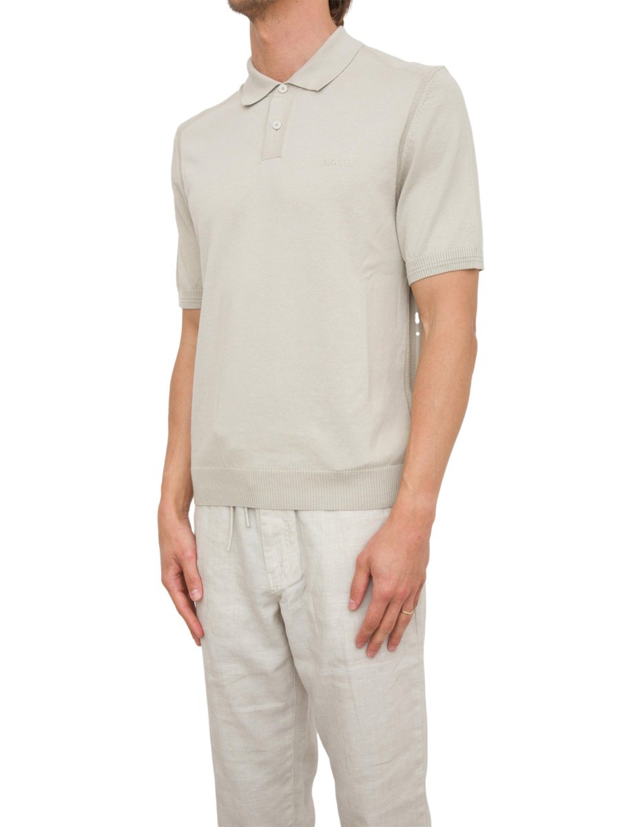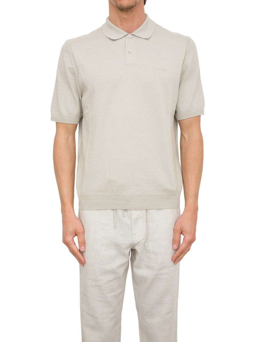Un maglione casual stile polo a maniche corte BOSS Uomo con vestibilità regular fit e logo ricamato sulla parte sinistra del petto.