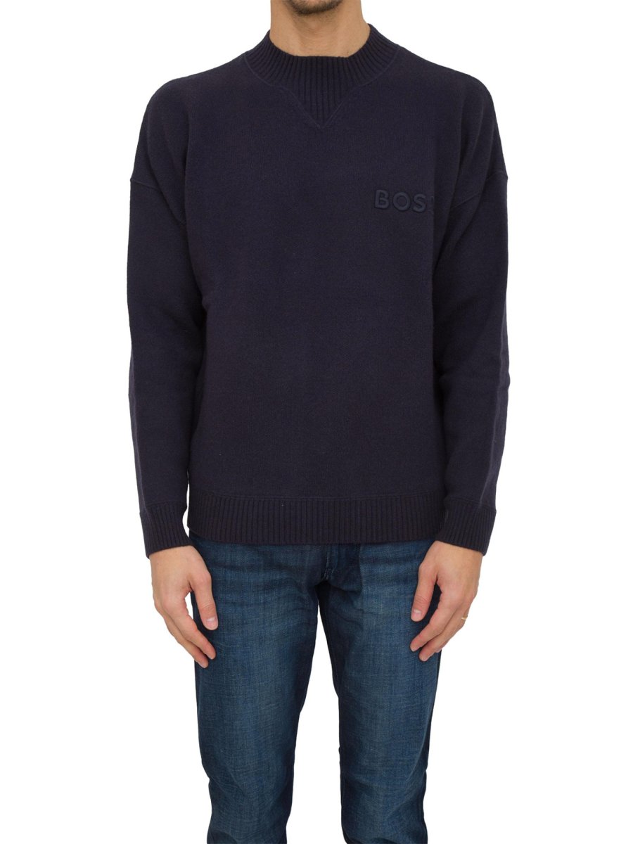 Un maglione relaxed fit BOSS Uomo realizzato in pura lana con collo a lupetto, dettaglio a V e logo ricamato.