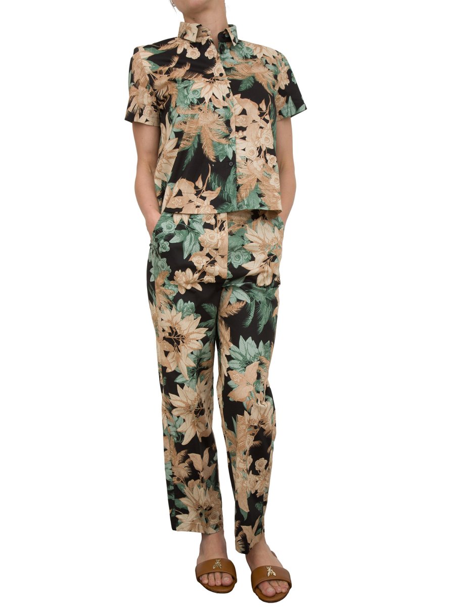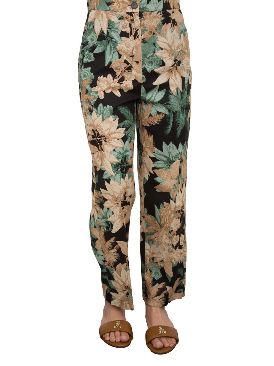 Женские брюки Emme Marella прямого кроя из чистого хлопкового стрейч-поплина. Сплошной цветочный узор на черной основе нарушает строгость конструкции, привнося мужественное настроение. Застежка на пуговицы и потайную молнию, складки спереди и сзади, французские боковые карманы.
