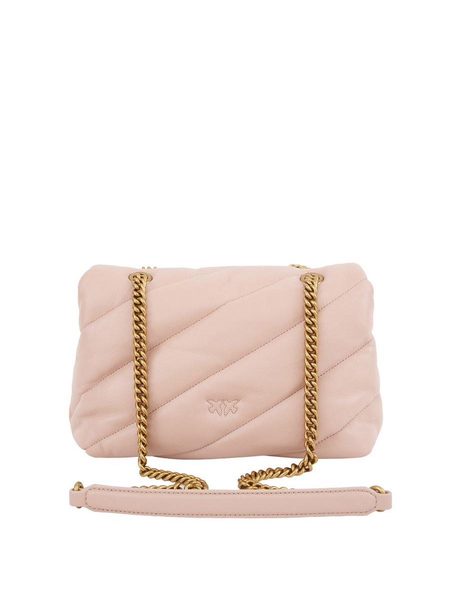 Borsa Pinko Classic Love Bag Puff in morbida nappa con maxi trapuntatura obliqua. La chiusura è completata dall'iconica fibbia in metallo Love Birds Diamond Cut. L'interno è foderato in microfibra scamosciata e comprende tramezza chiusa con zip e tasca a parete. La tracolla combina la classica catena metallica rotonda al pratico spallaccio in nappa. Altezza: 19 cm Larghezza: 11 cm Lunghezza: 27 cm