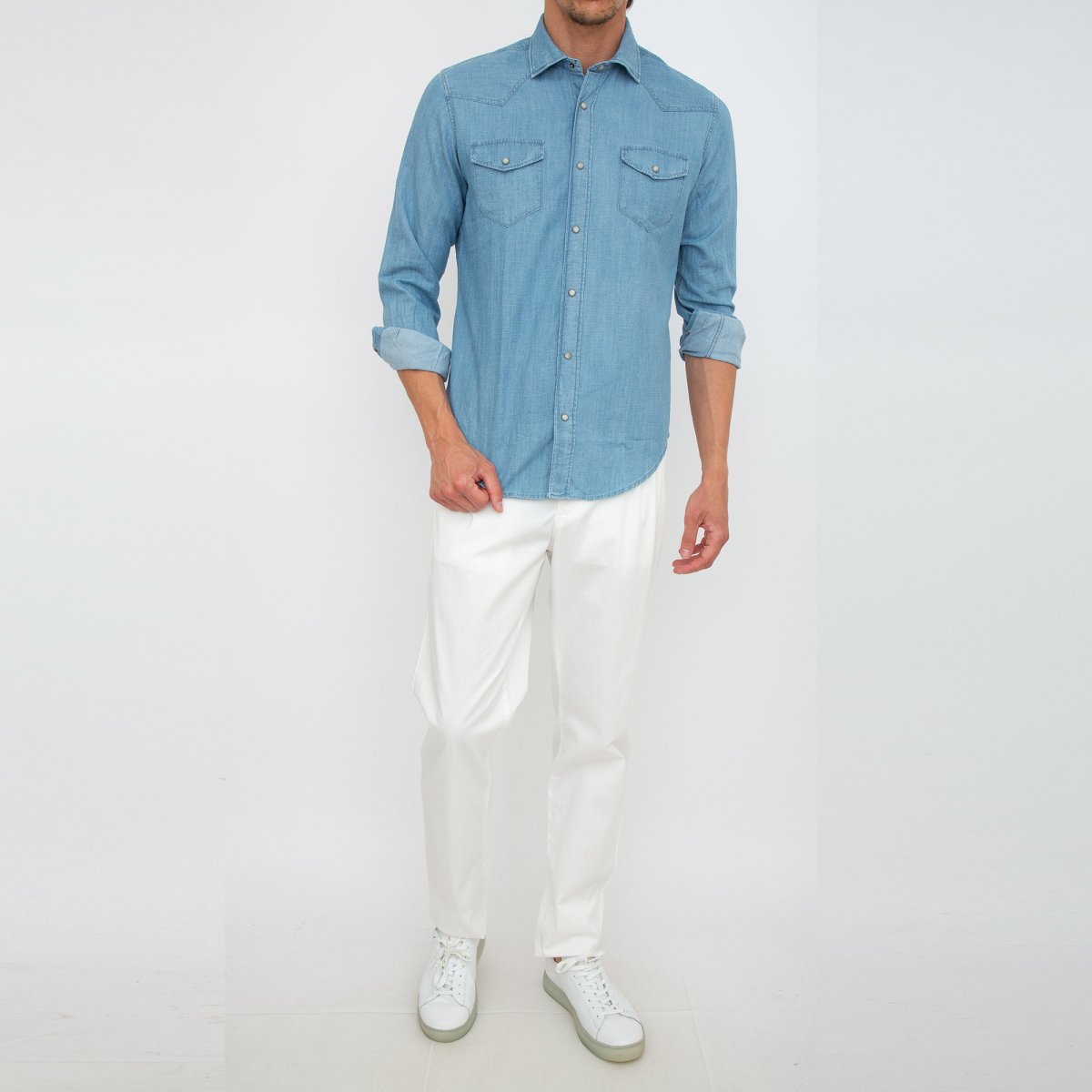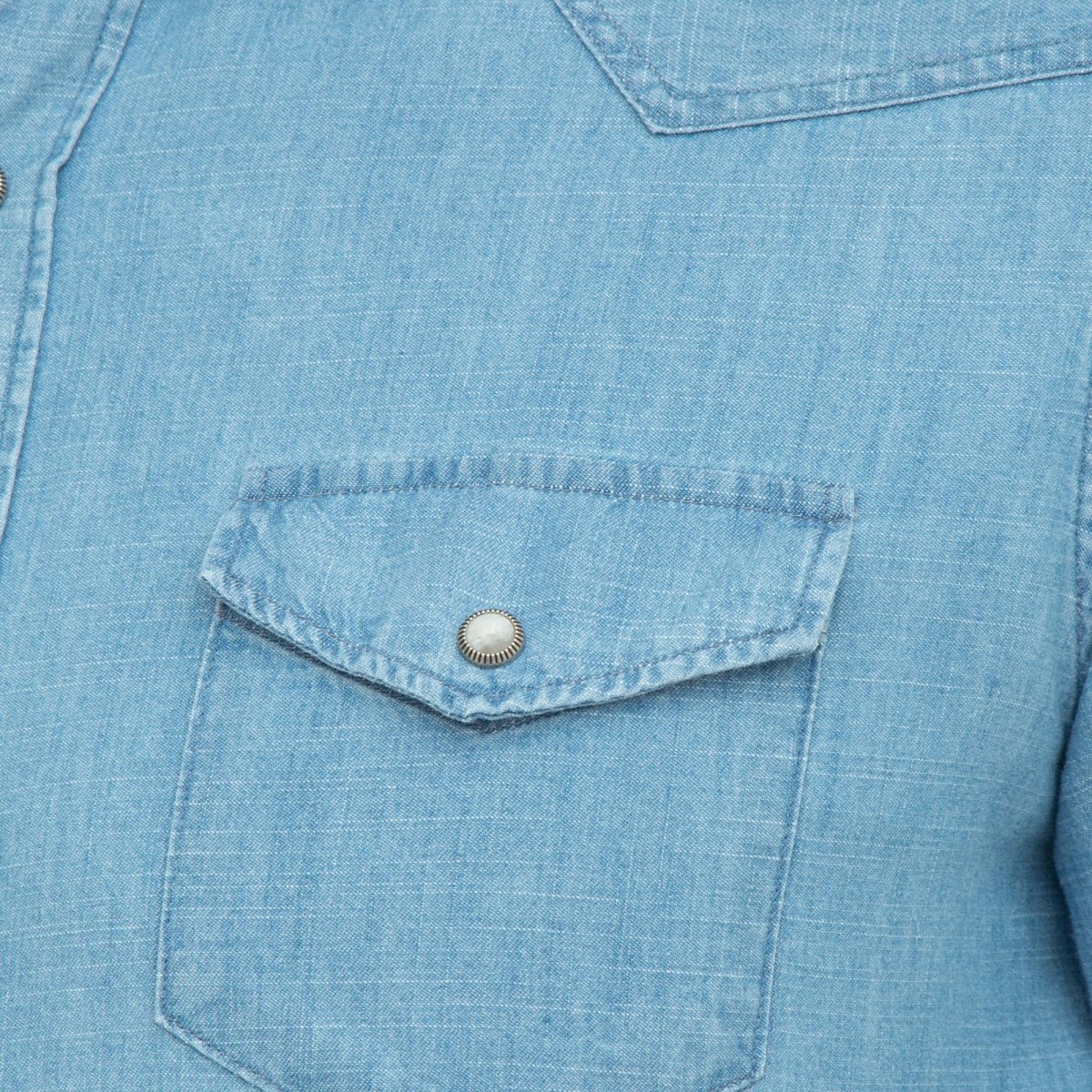 Camicia Texas a maniche lunghe, cotone, batista, bottoni goffrati color argento, colletto classico, chiusura frontale con bottoni a pressione, maniche lunghe, orli con bottone, orlo curvo e due tasche frontali con pattina.