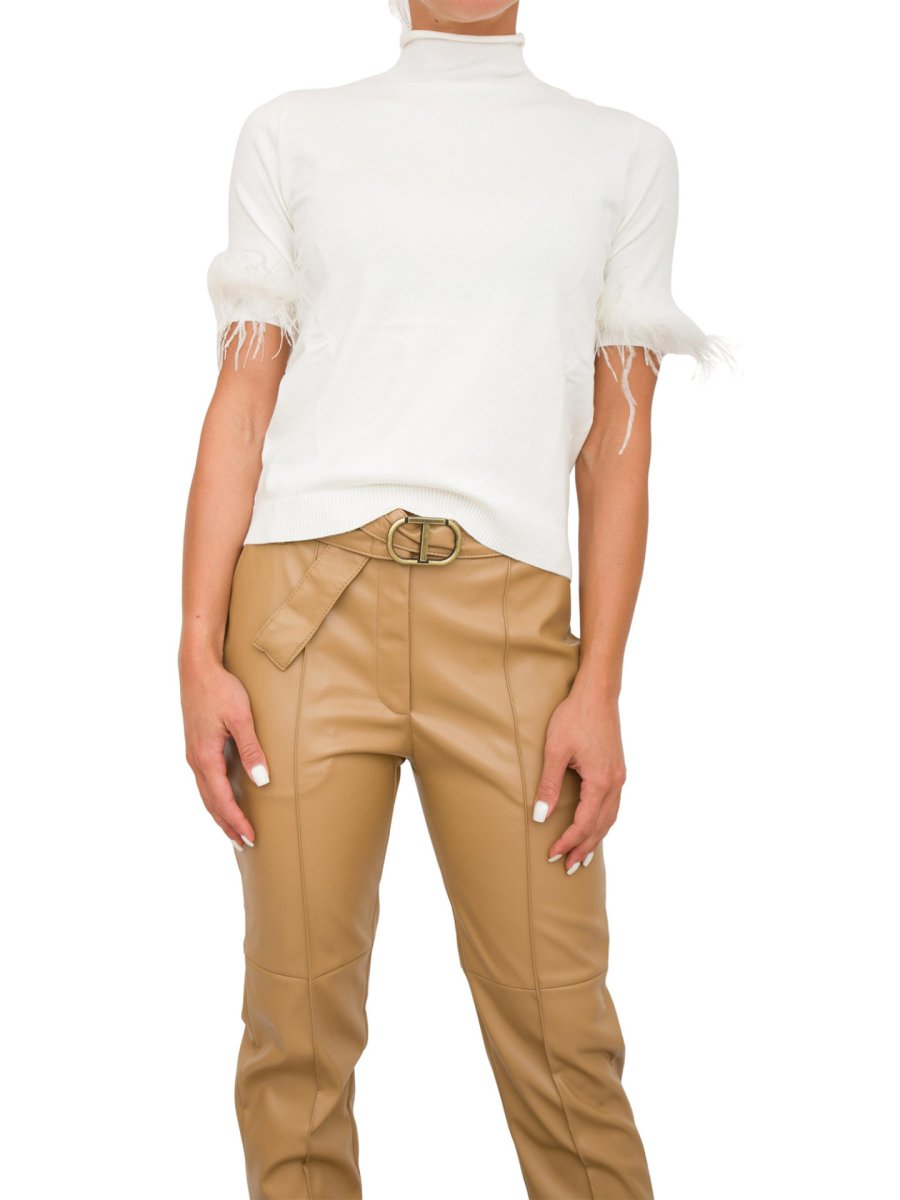Свитер из смесовой вискозы стрейч с короткими рукавами, отделанными съемной отделкой из перьев в тон, воротник-стойка, металлическая пластинка с логотипом овальной формы на спине, стандартная посадка.