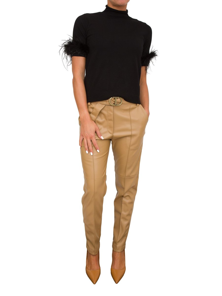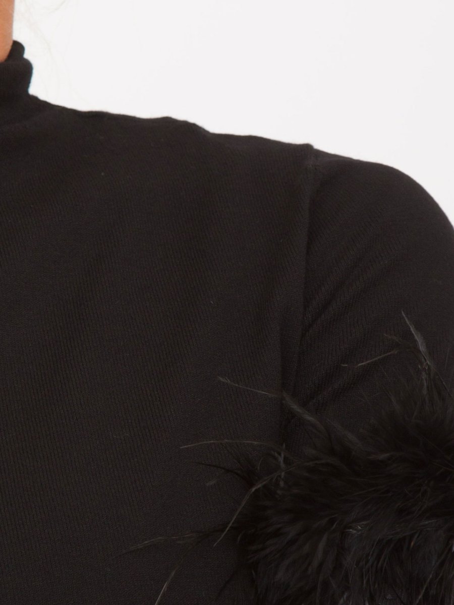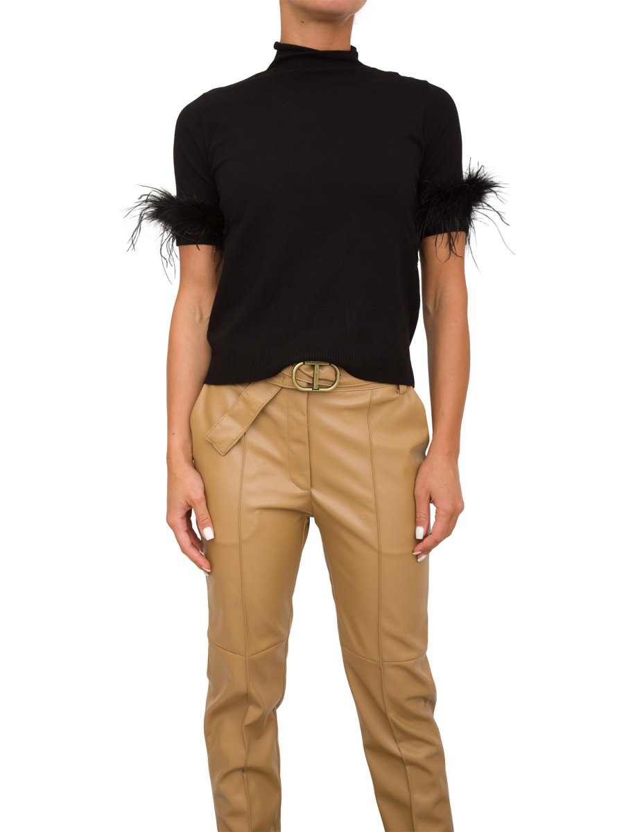 Свитер из смесовой вискозы стрейч с короткими рукавами, отделанными съемной отделкой из перьев в тон, воротник-стойка, металлическая пластинка с логотипом овальной формы на спине, стандартная посадка.
