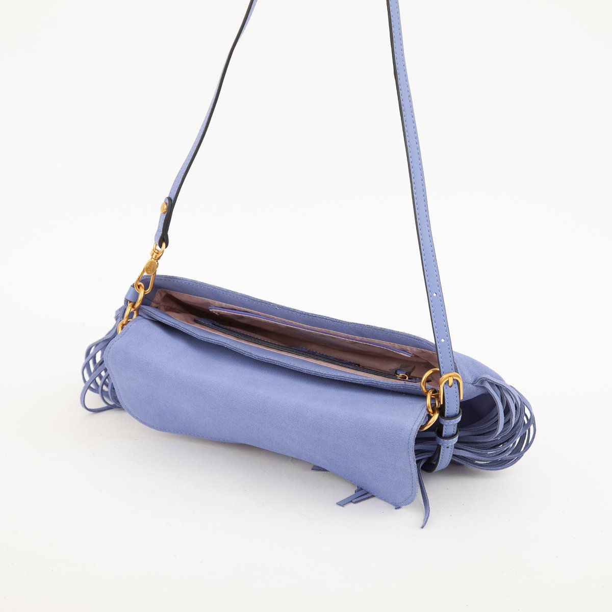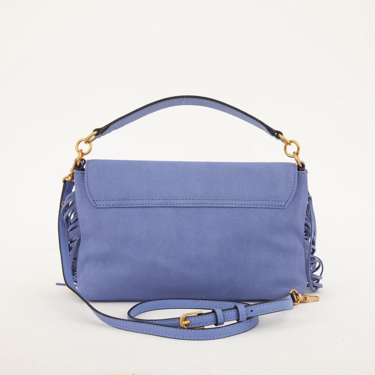 Borsa a mano in pelle scamosciata, frange sui lati, logo in metallo sul davanti, comodo manico, tasca interna con zip e chiusura con patta e bottone.