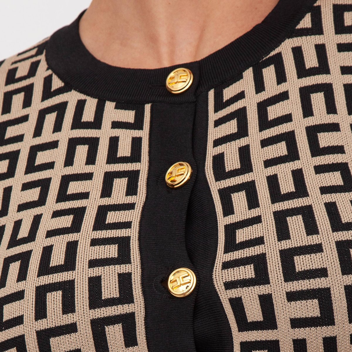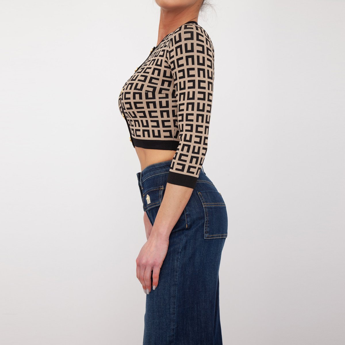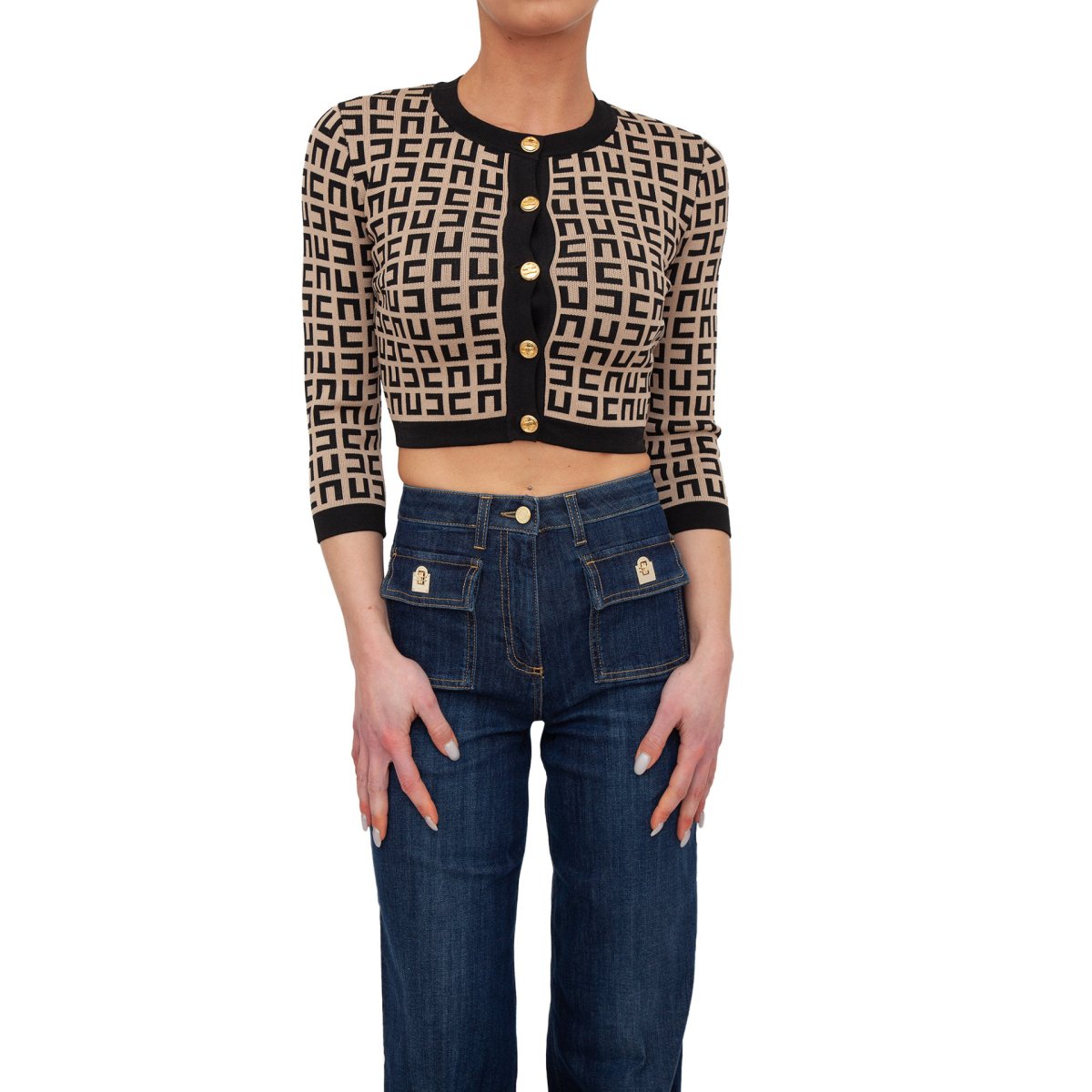 Cardigan girocollo Elisabetta Franchi, con bottoni logo dorati e maniche 3/4.