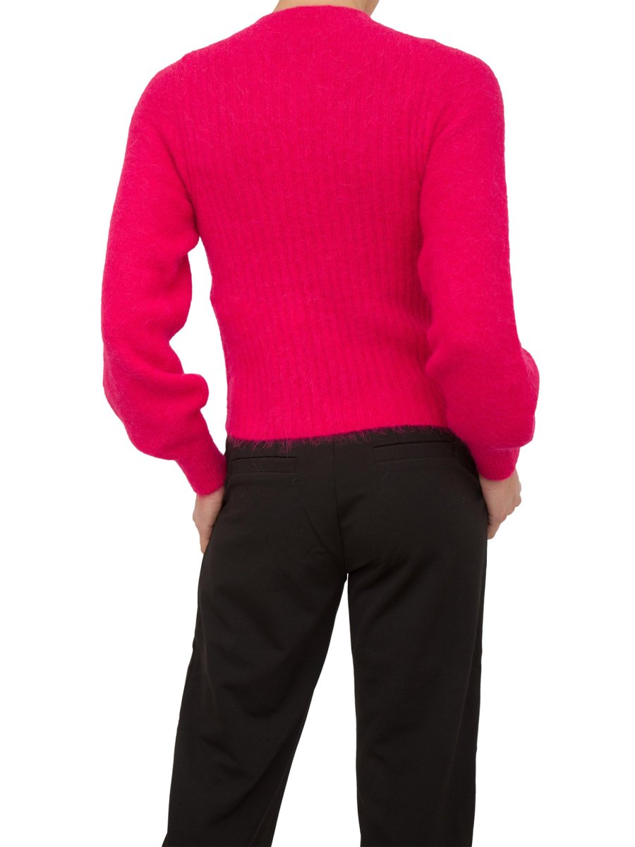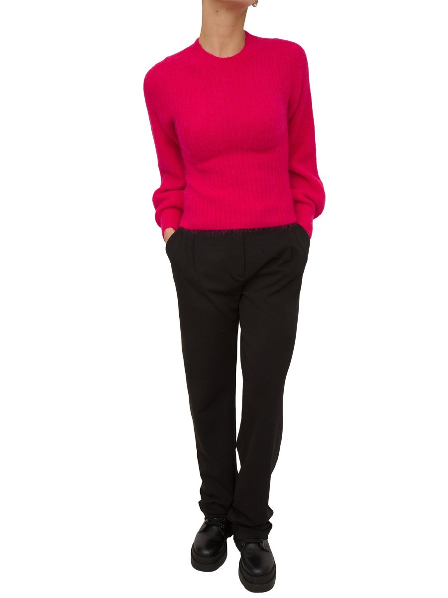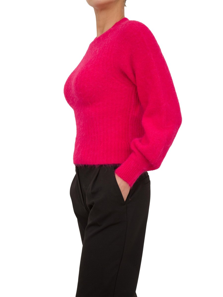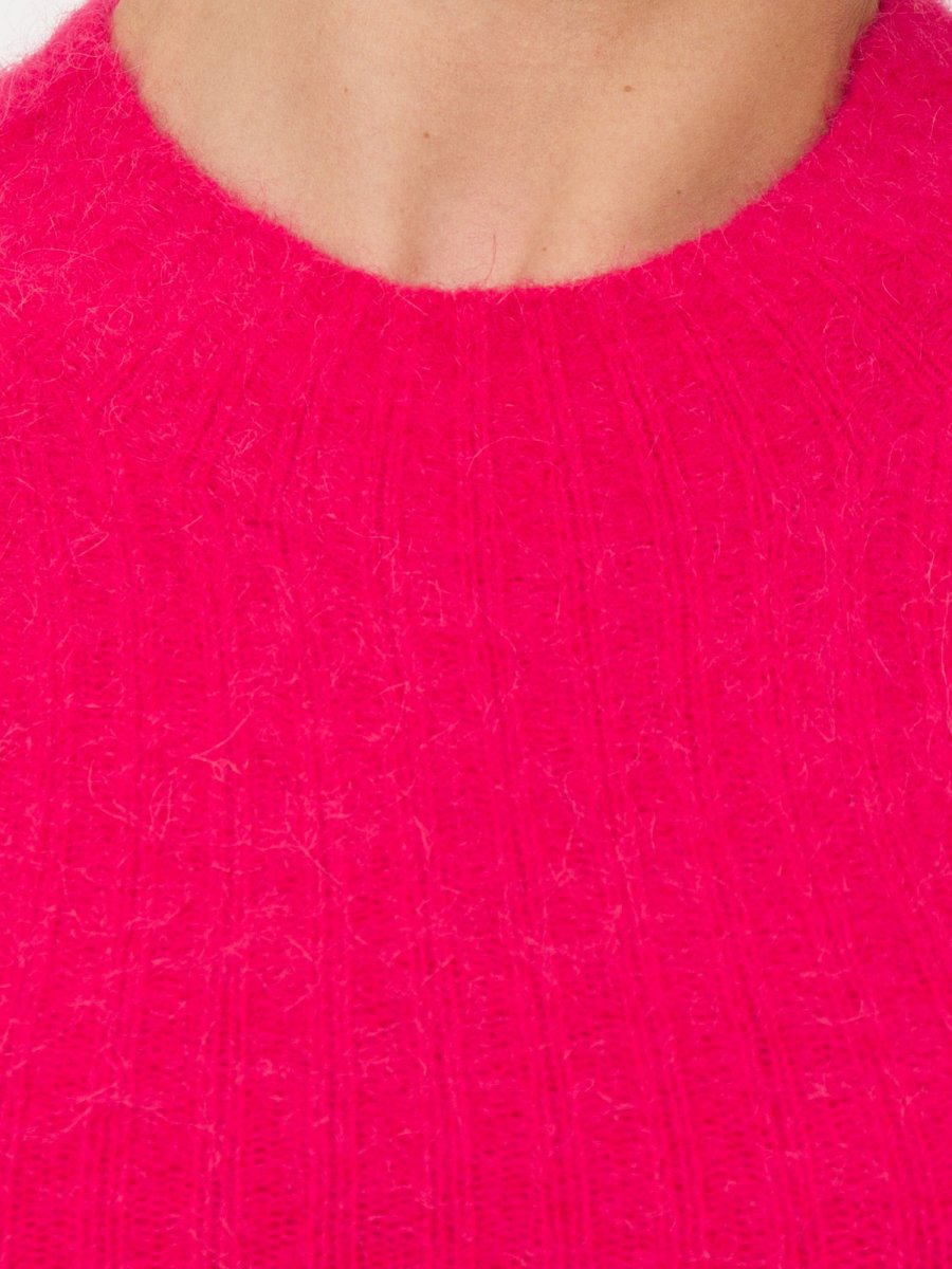 Maglia in misto alpaca, linea dritta con fronte e retro a coste. Collo alto, maniche ampie con polsino a coste.