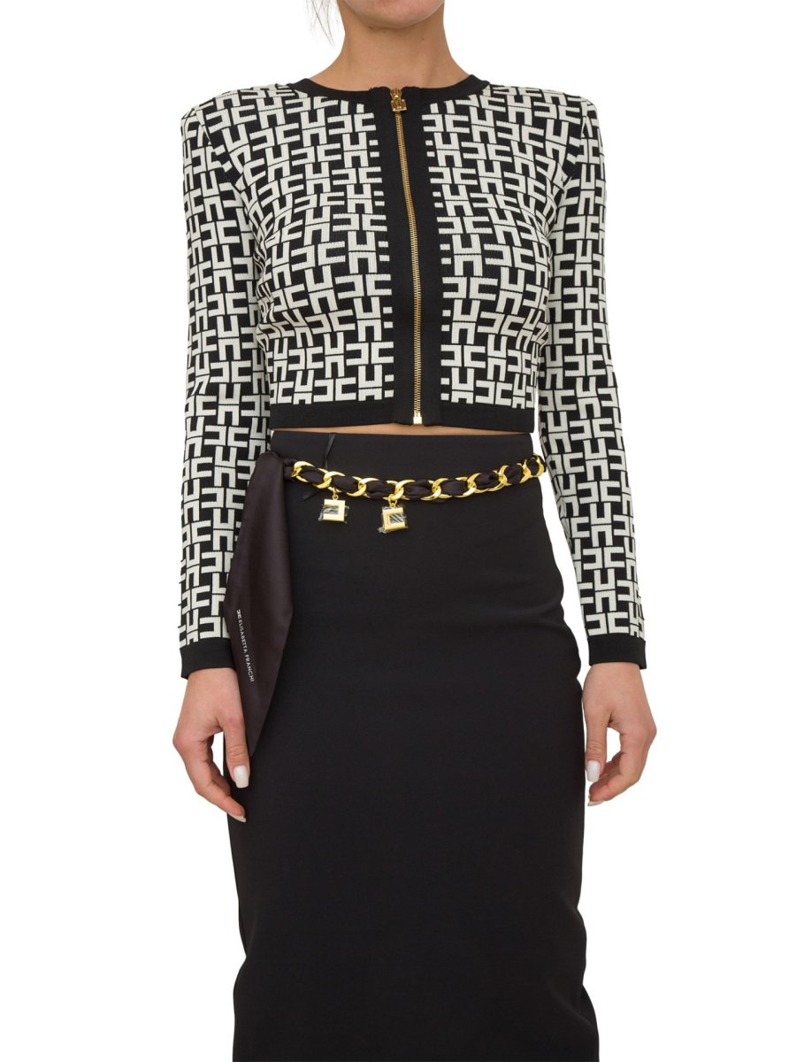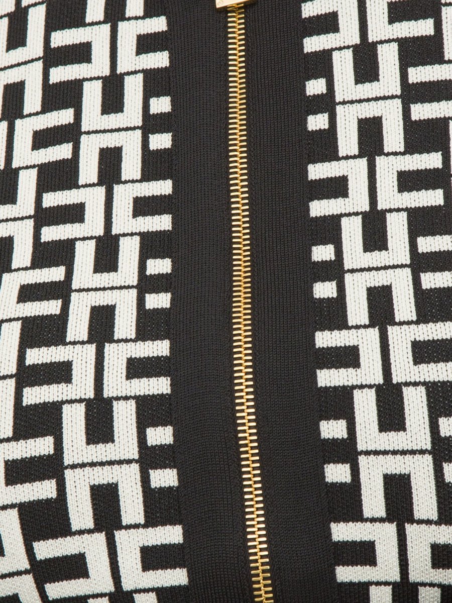 Cardigan cropped in viscosa jacquard bicolore con logo doppia C all-over. È caratterizzato da chiusura frontale con zip in metallo dorato.