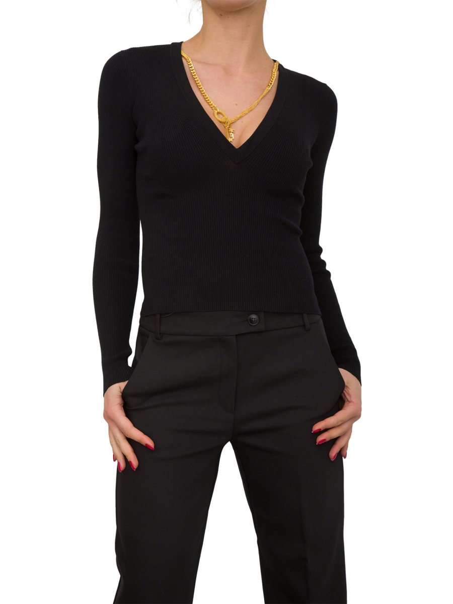 Top a maniche lunghe in viscosa a costine con scollo a V impreziosito da accessorio collana in metallo dorato.