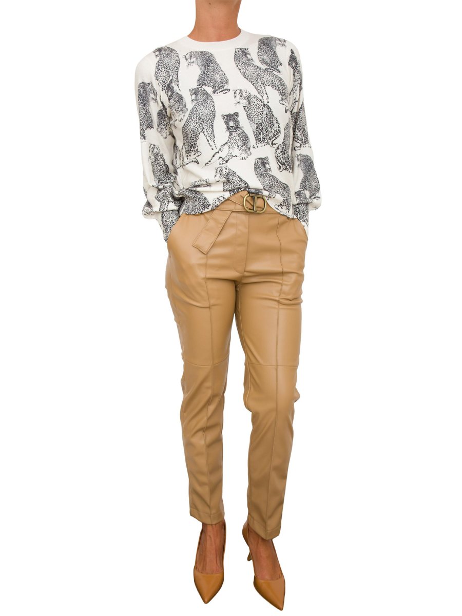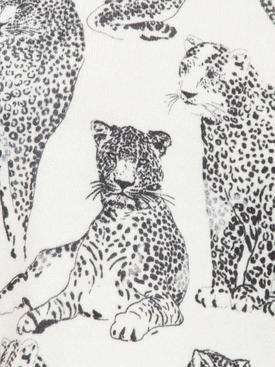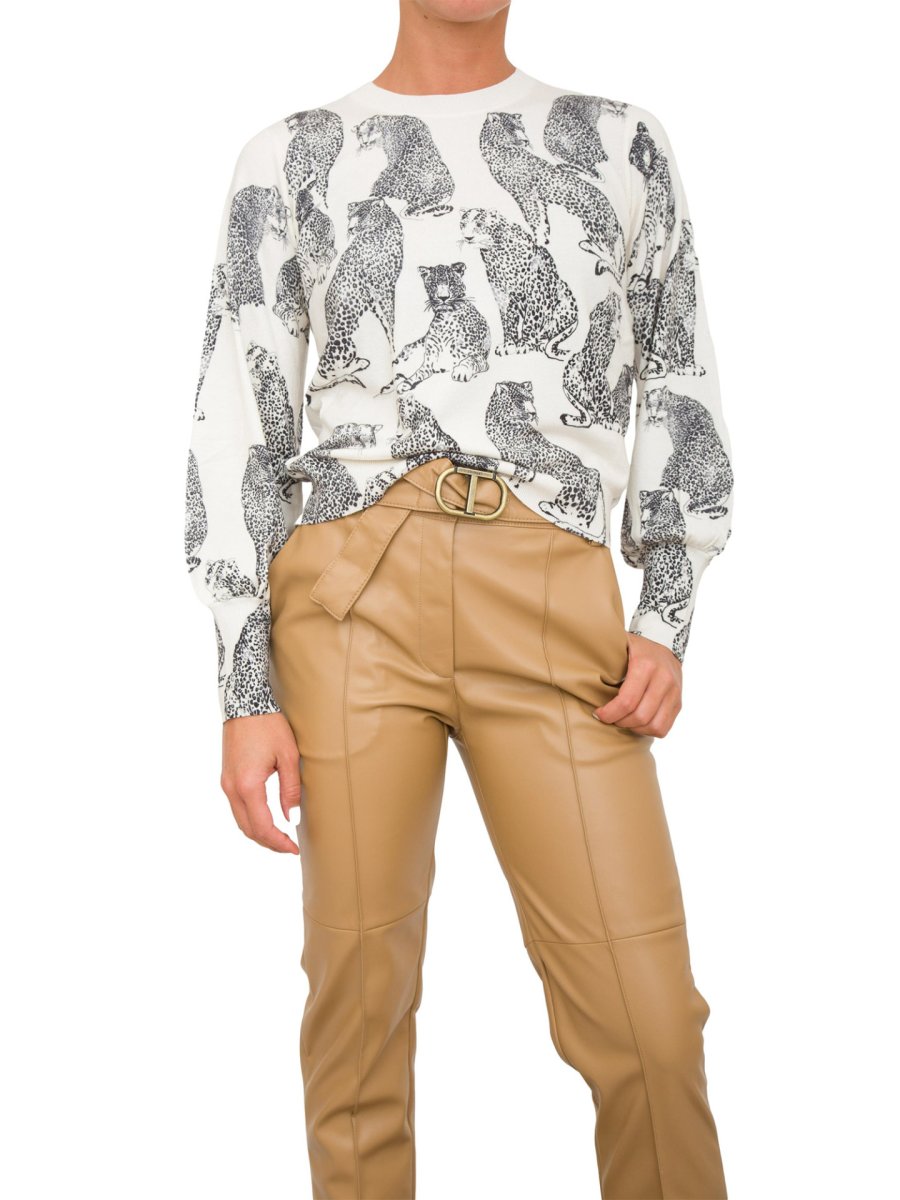 Свитер из смесовой вискозы стретч с принтом ягуара и перфорированной отделкой спереди, круглым вырезом, длинными рукавами, ребристой отделкой, металлической пластинкой с логотипом в виде буквы «Т» сзади, мягкий крой.