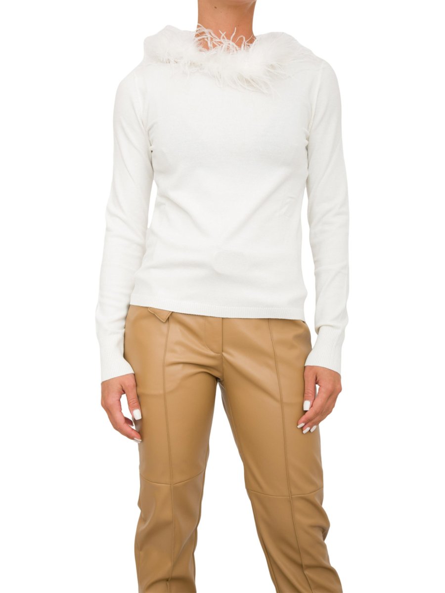Свитер Twinset в рубчик со съемной деталью из перьев, обтянутыми тканью пуговицами, золотистой бляшкой с логотипом, вырезом-лодочкой и длинными рукавами.