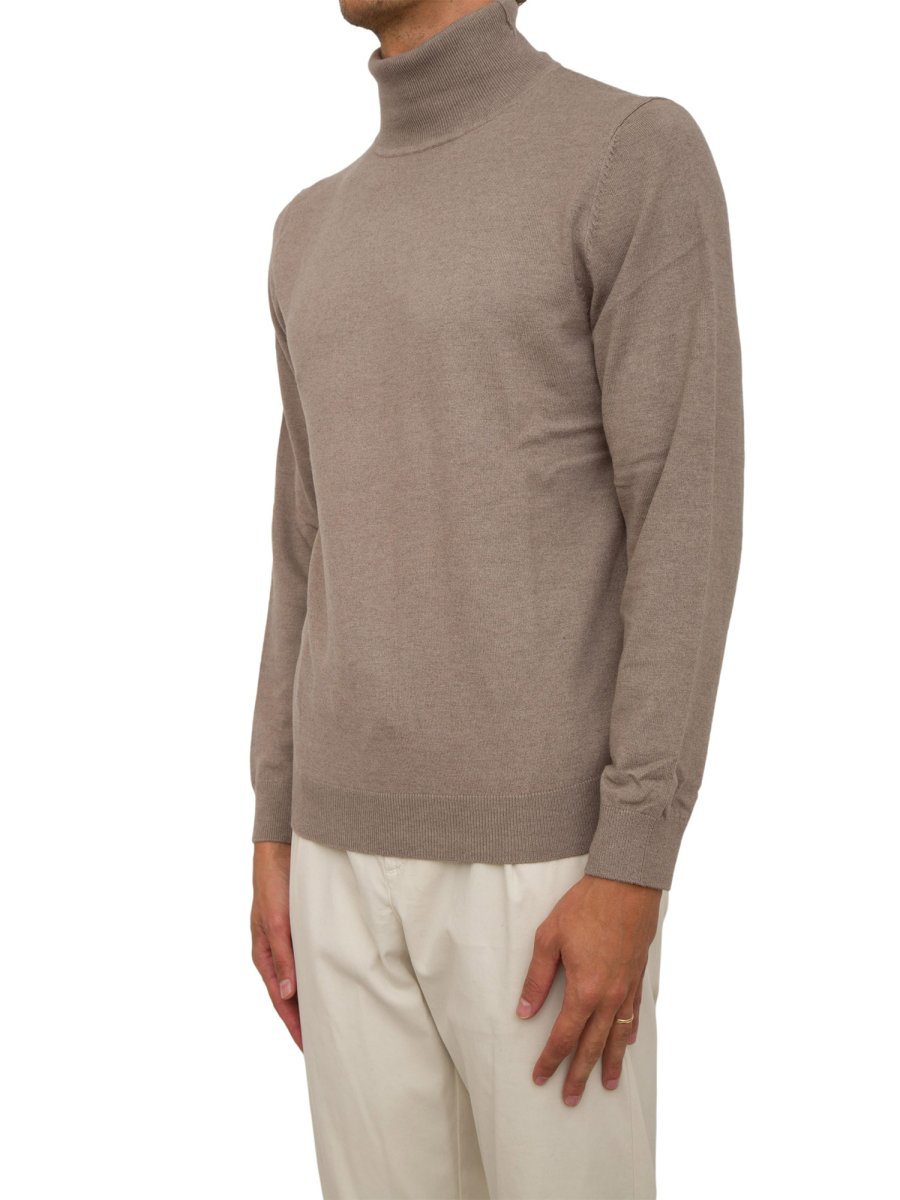 Свитер с высоким воротником стандартной посадки. Выполнен из смеси шерсти и кашемира. Доступен в однотонном цвете, имеет ребристую вязку на манжетах, подоле и воротнике. Завершает дизайн металлическая пластина, нанесенная на спинку.