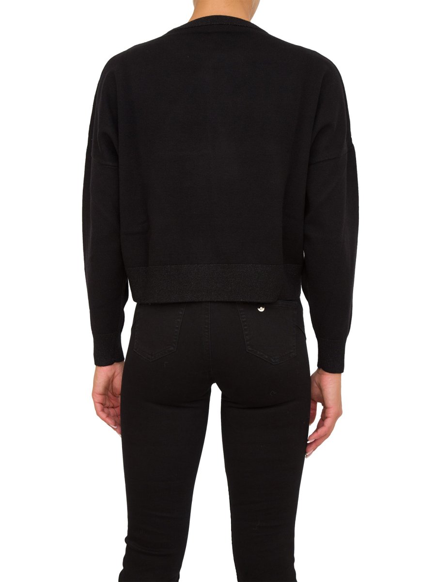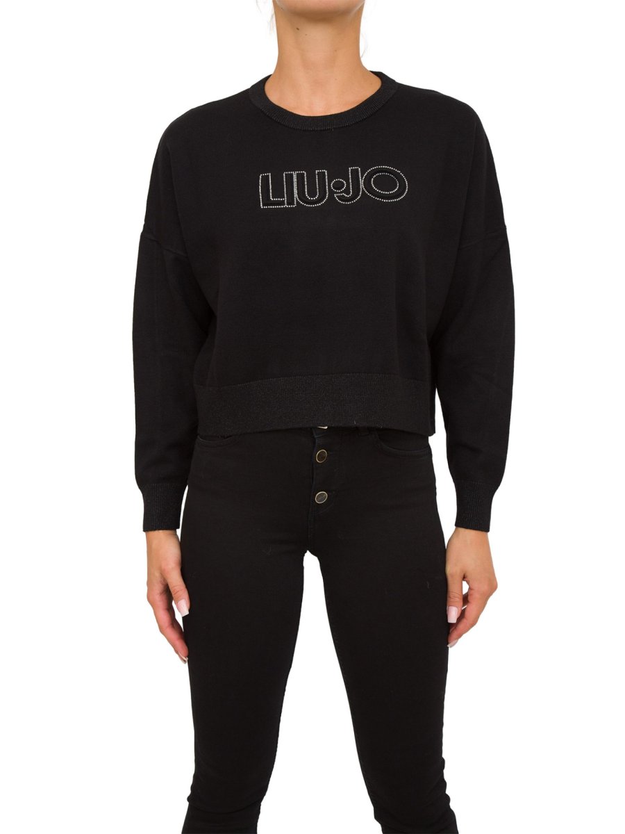 Pullover da donna Liu-Jo realizzato in misto viscosa, interventi in lurex®, logo a rilievo con strass sul davanti, taglio girocollo, maniche lunghe e bordi rifiniti a costine.