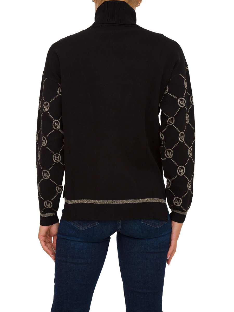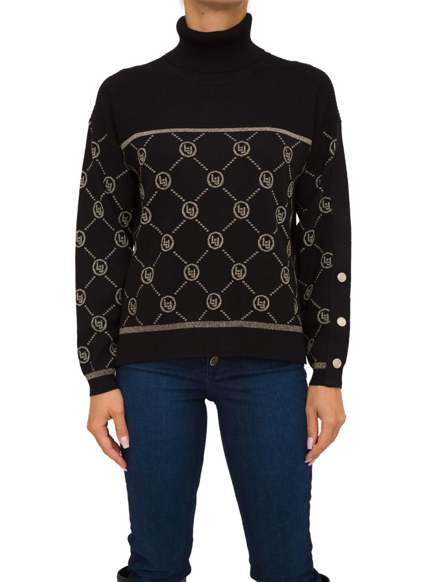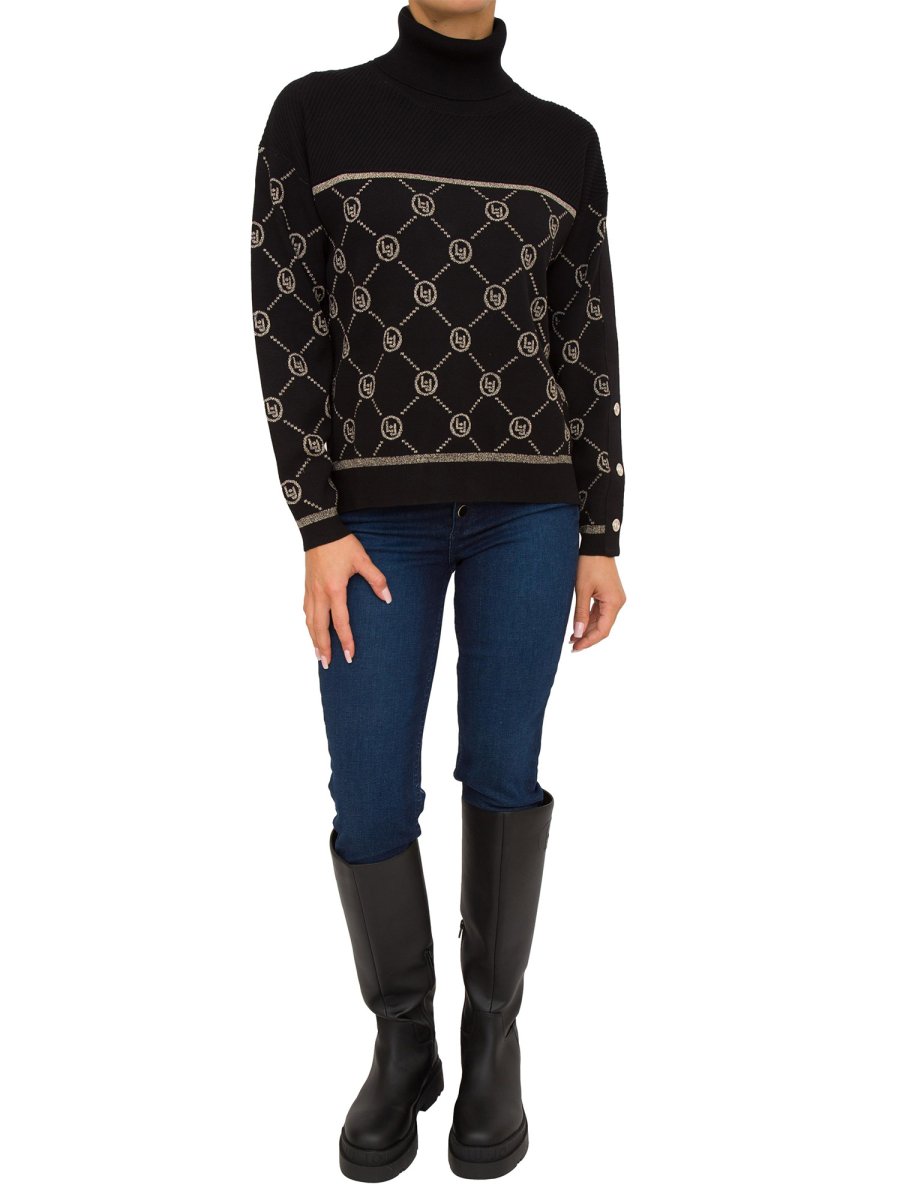 Dolcevita donna LIU-JO in maglia di misto viscosa, interventi in lurex®, motivo a rombi con logo jacquard, maniche lunghe a palloncino, bottoni decorativi sulla manica, spacchetti laterali al fondo, orlo più lungo sul retro e bordi rifiniti a costine.