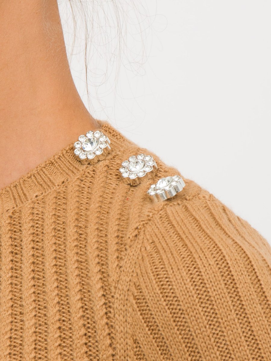 Maglia da donna Liu-Jo in misto lana, lavorazione a coste e a trecce, bottoni gioiello sulla spalla, taglio girocollo, maniche lunghe e logo in metallo sul retro.