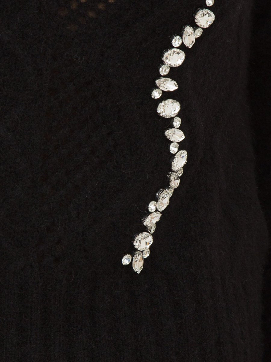 Pullover donna Liu-Jo in misto lana stretch, trama grafica sul davanti, lavorazione a costa inglese sul retro, applicazioni gioiello, collo a revers, maniche lunghe e bordi rifiniti a coste.