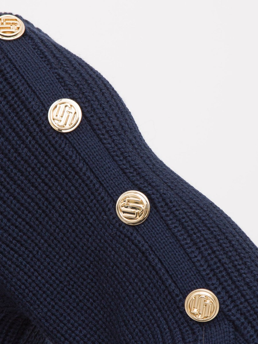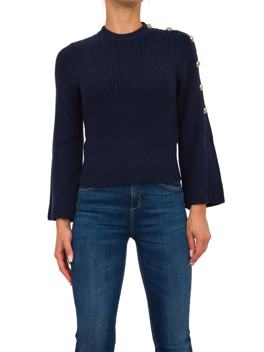 Pullover donna Liu-Jo realizzato in misto lana, taglio girocollo, maniche lunghe con spacchi, bottoni logati sulla spalla e collo e fondo rifiniti a costine.