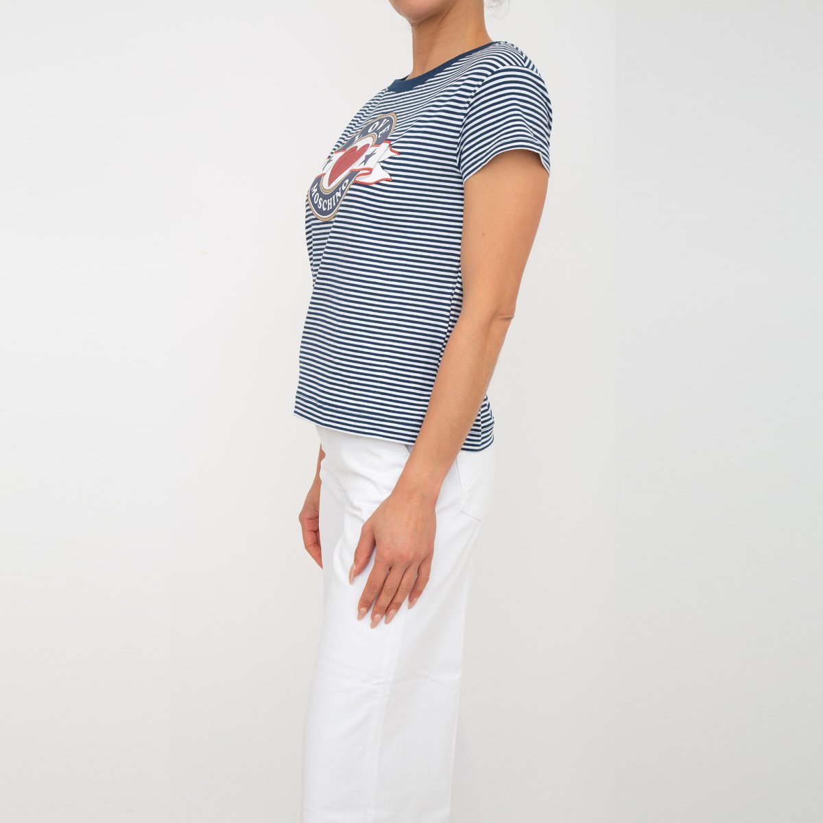 T-shirt a righe, stampa con logo sul davanti, scollo rotondo, maniche corte e orlo dritto.