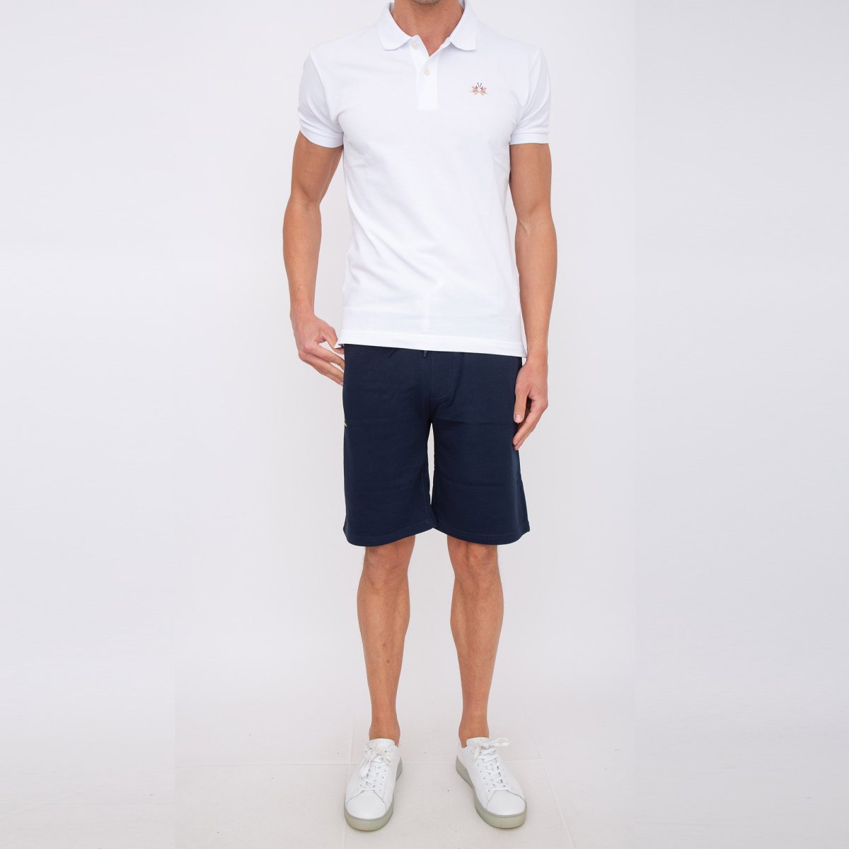 Bermuda da uomo in tinta unita, realizzato in un tessuto di misto cotone e sintetico. La lunghezza è fino al ginocchio e la coulisse in vita offre una vestibilità regolare che lo rende adatto ad ogni tipo di silhouette. Due tasche laterali ed una tasca posteriore completano il capo ed il logo stampato La Martina impreziosisce il design.