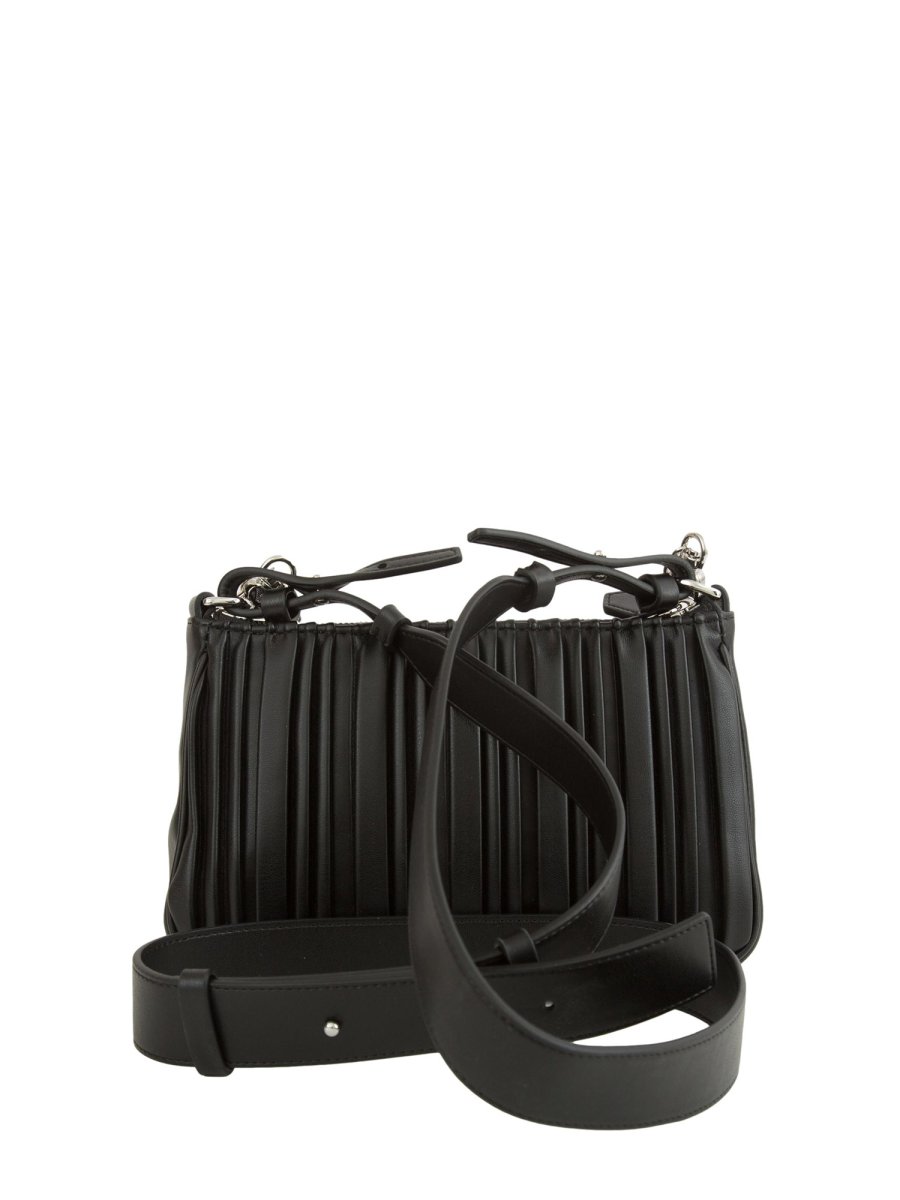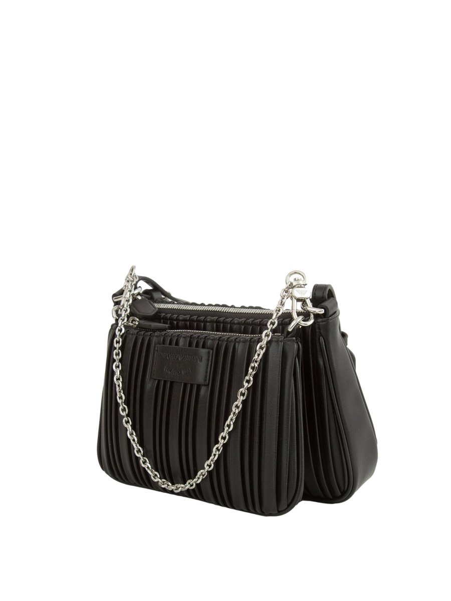 Mini bag con struttura multipochette realizzata in materiale riciclato certificato effetto nappa con lavorazione plissettata; provvista di doppia tracolla, una logata a nastro e una a catena, entrambe removibili e pensate per un doppio utilizzo: a spalla o crossbody. Dimensioni: 21,5 x 13,5 x 6,5 cm