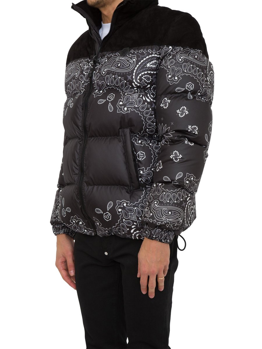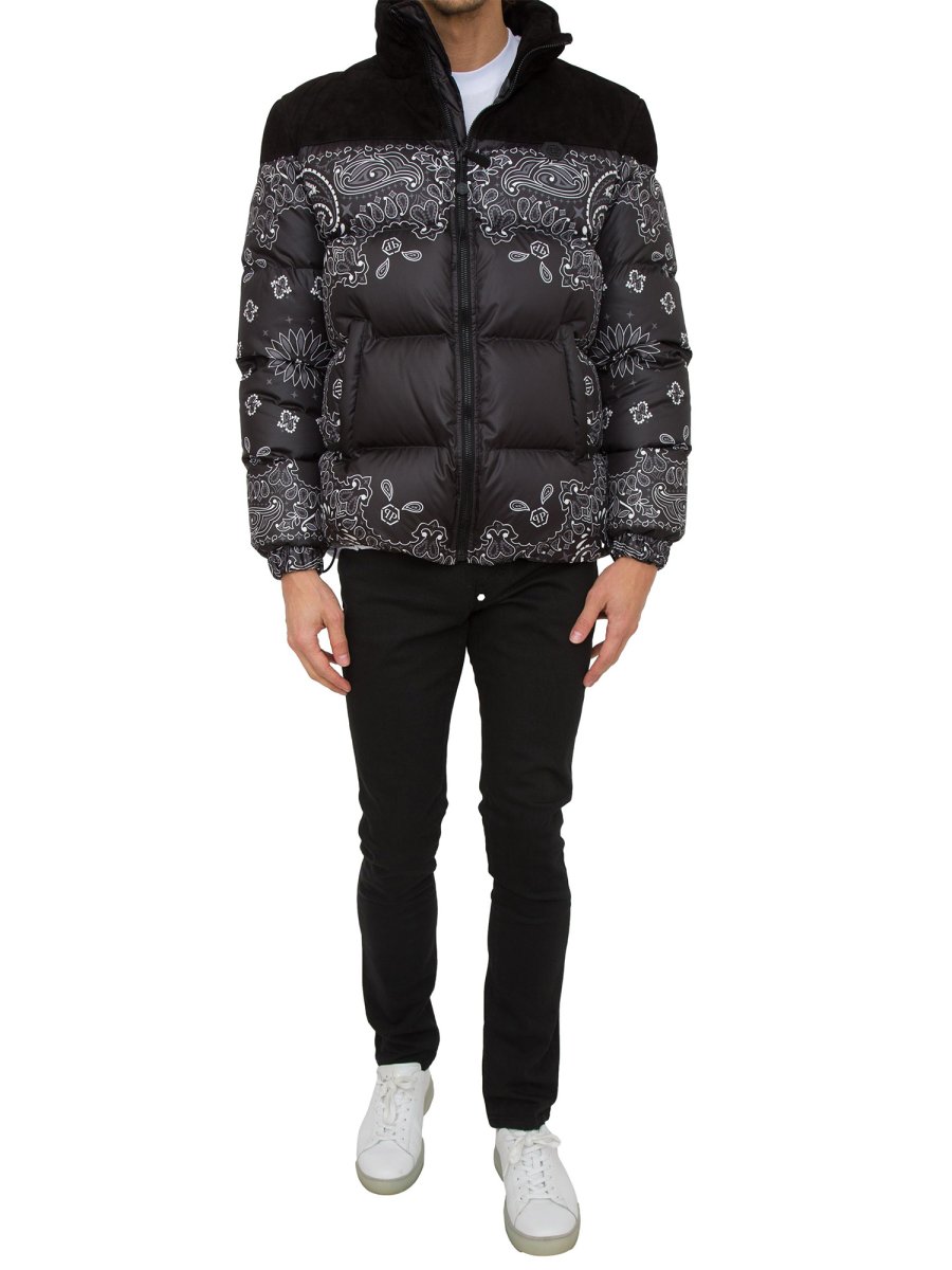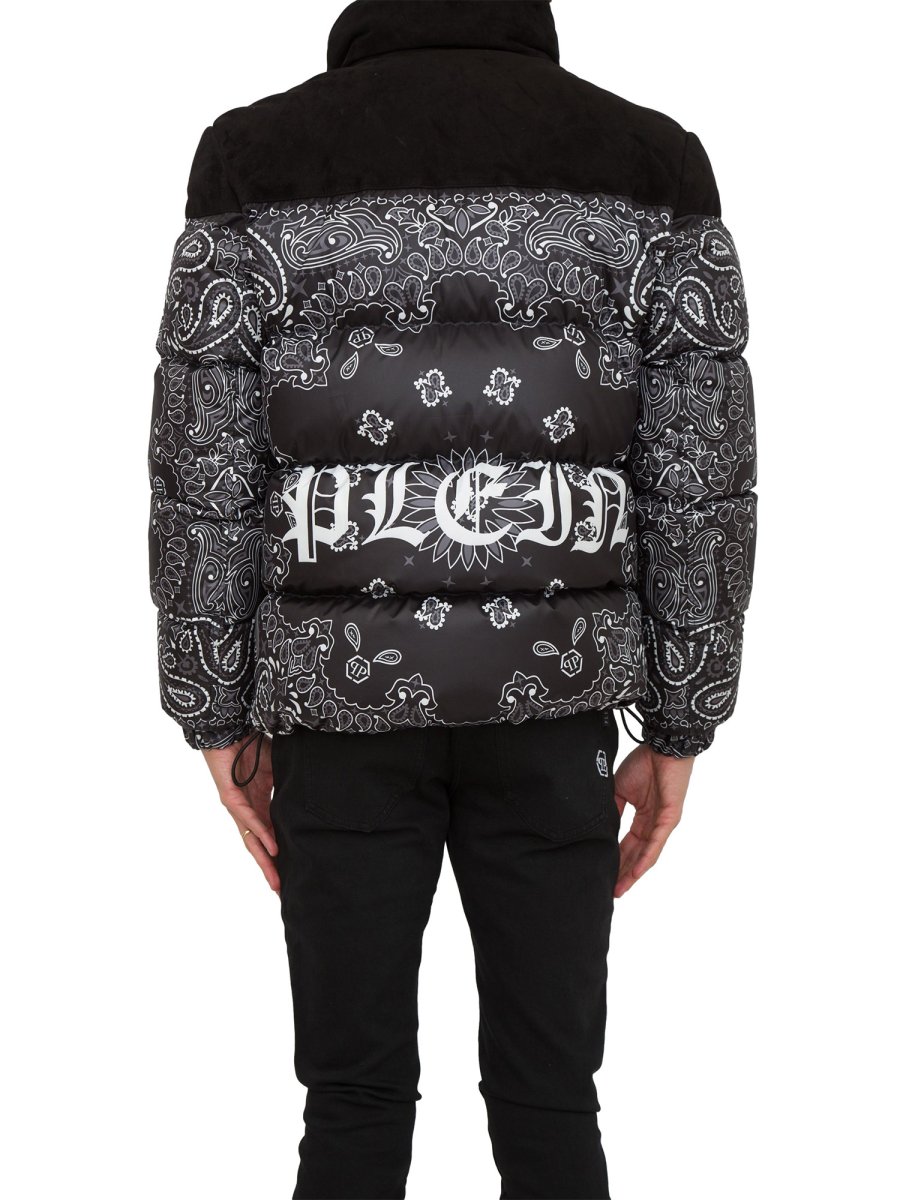 Bomber da uomo Philipp Plein realizzato in tessuto di nylon imbottito di vera piuma e trapuntato, dettagli di pelle scamosciata, decorazione con stampa del pattern ispirato ai disegni Paisley in stile Bandana, PP Hexagon su patch di pelle saffiano cucito sul punto cuore, chiusura regolata da zip, polsi con elastico, due tasche a filetto con bottone a pressione nascosto e interno foderato.