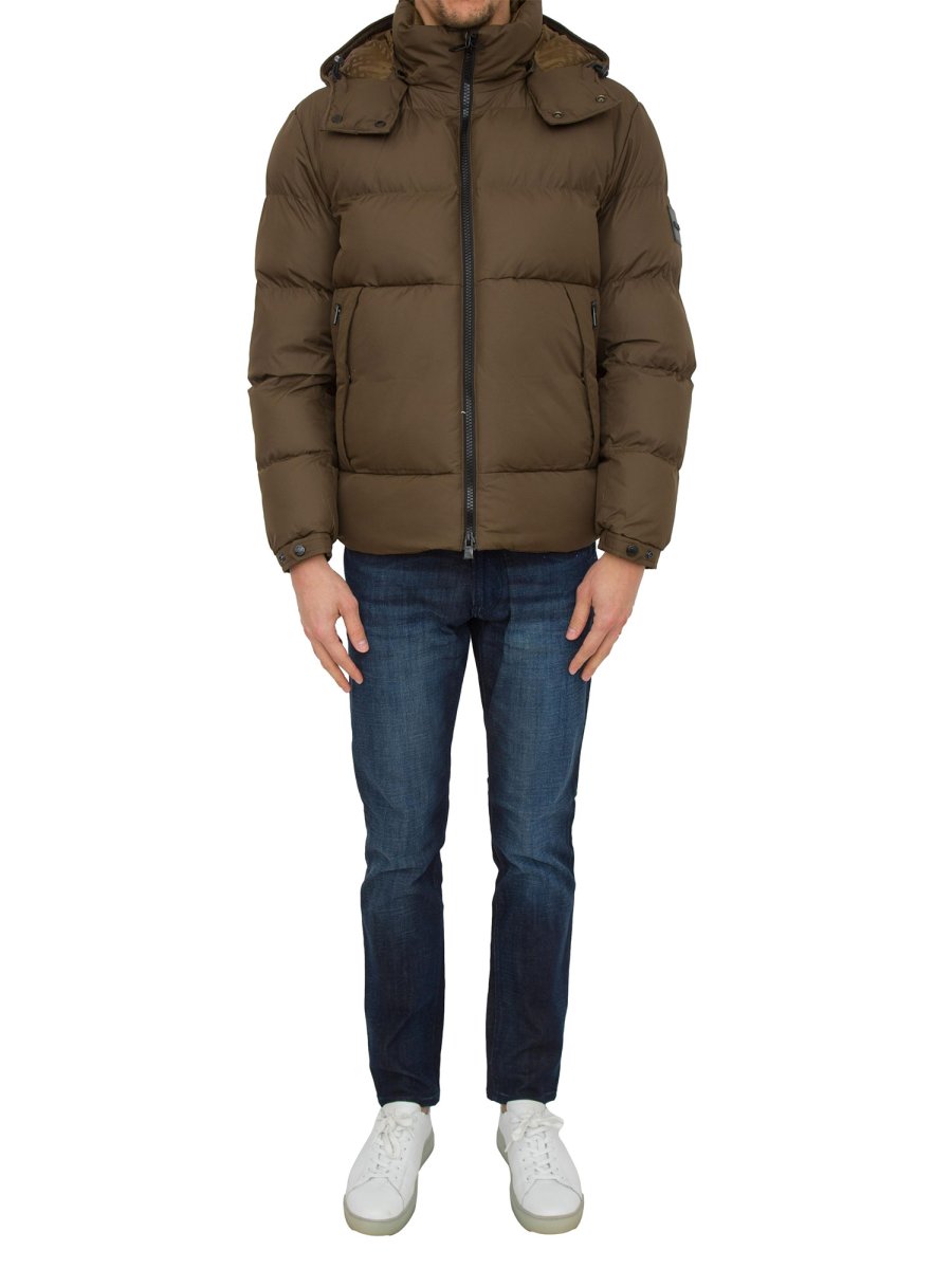 Un giubbotto imbottito con cappuccio BOSS Uomo realizzato in tessuto idrorepellente con monogramma all'interno del colletto e targhetta con logo sulla manica.