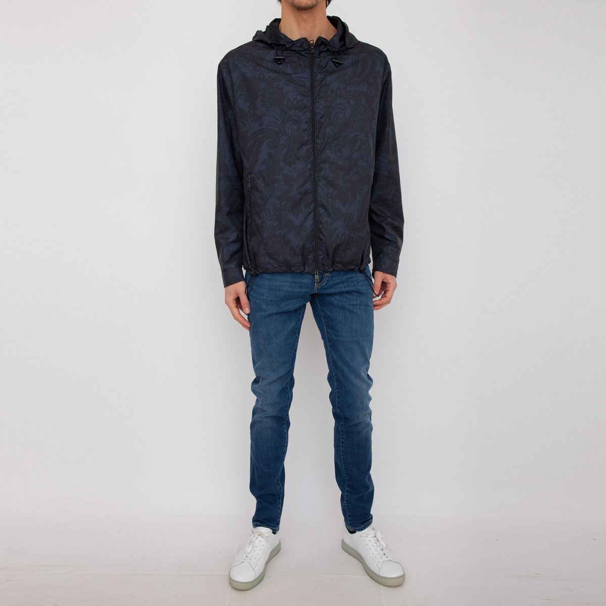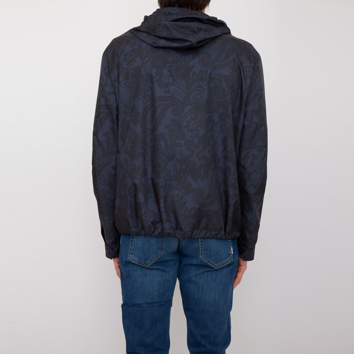 Giubbotto sportswear realizzato in tessuto tecnico con cappuccio, caratterizzato da motivi Paisley floreali all over ton-sur-ton, e caratterizzato da targhetta ETRO sulle tasche.