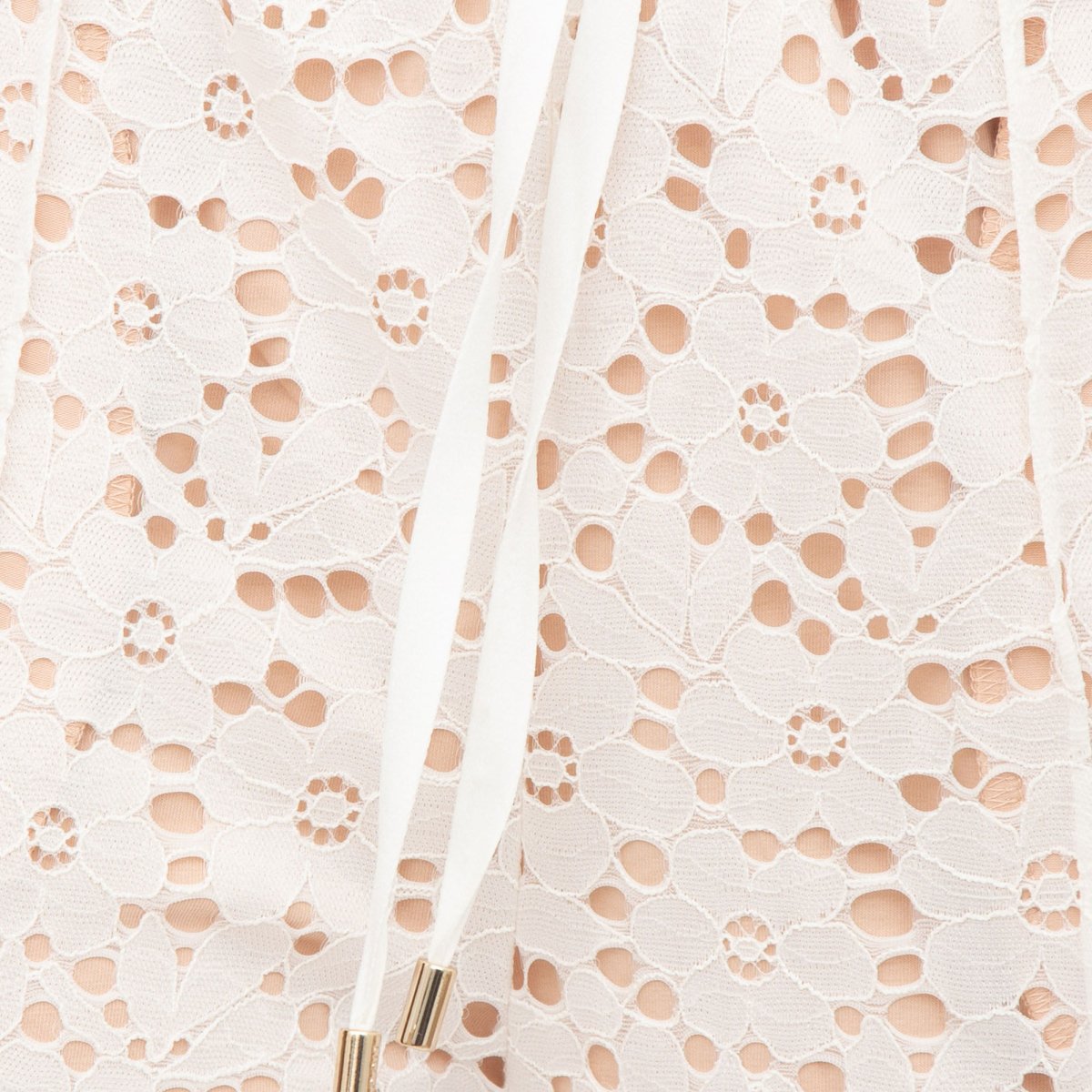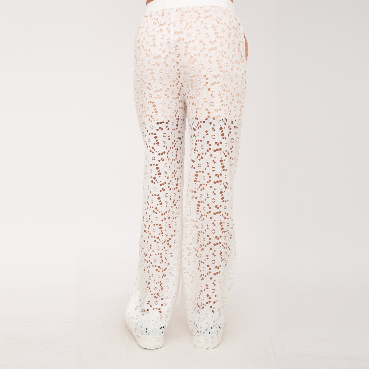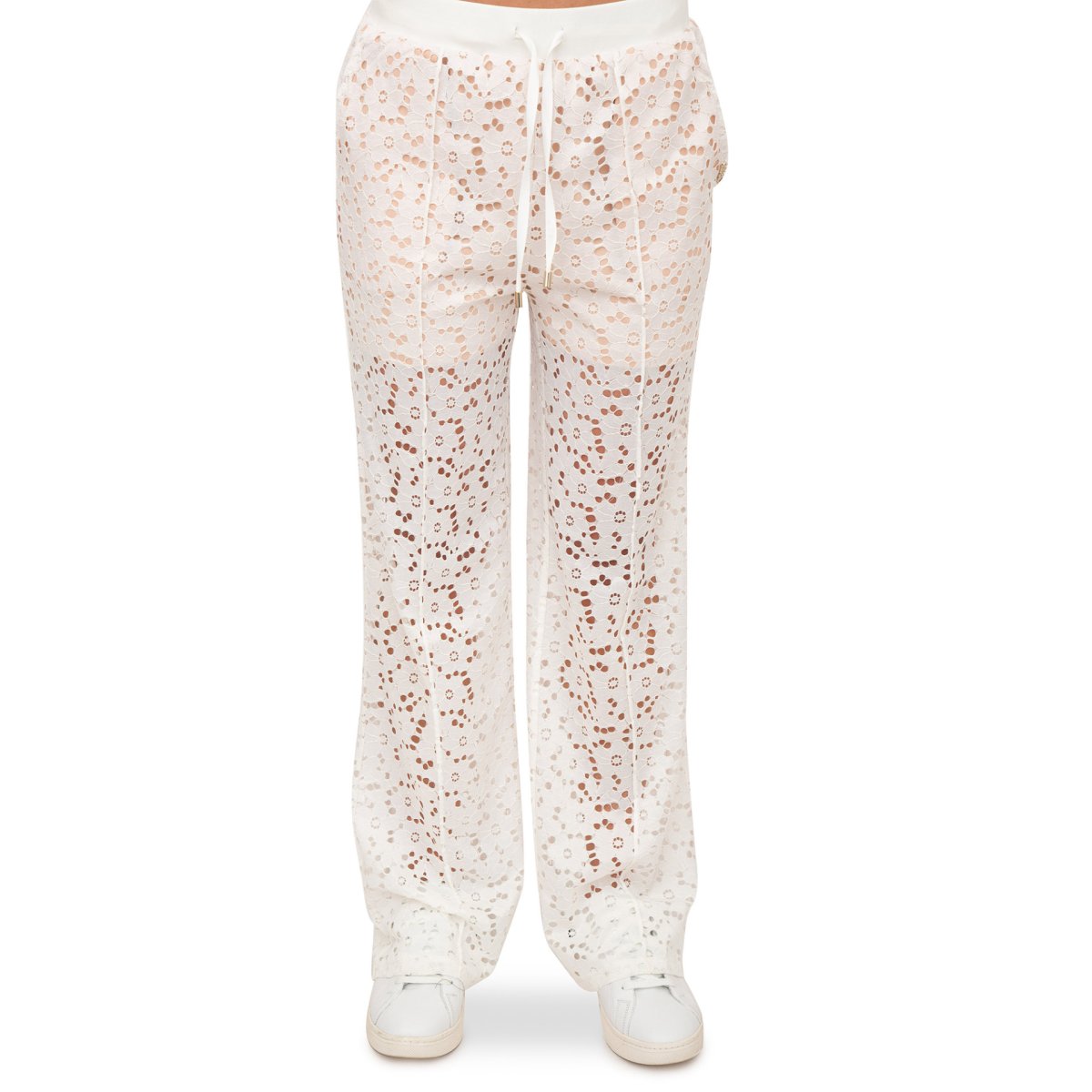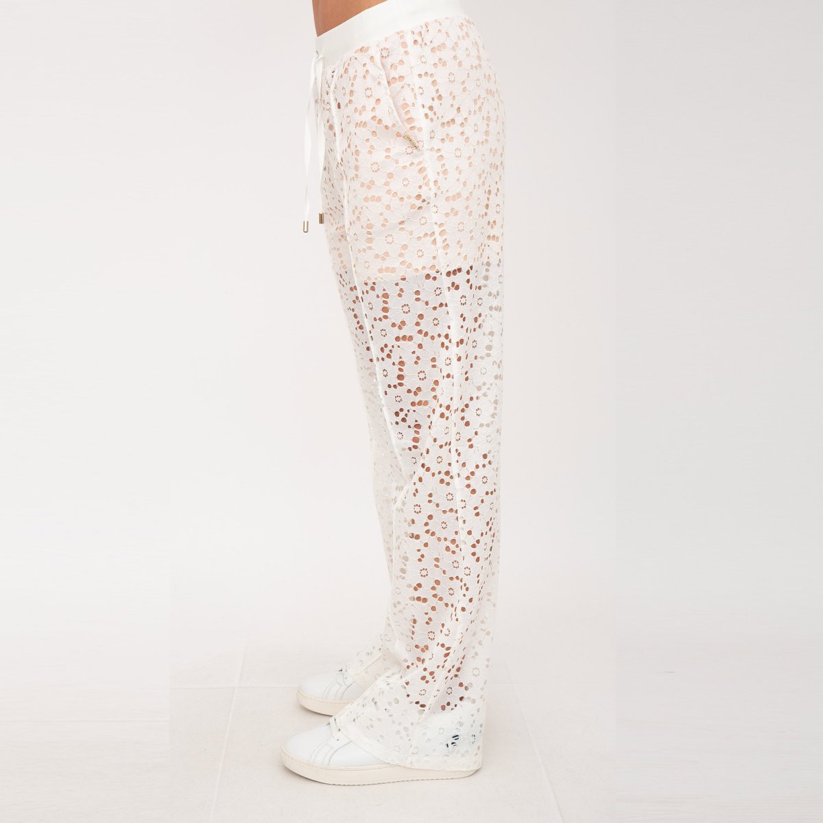 Pantaloni in jersey stretch, dettaglio in pizzo San Gallo, piega cucita sul davanti, cintone elastico con coulisse in vita, tasche sui fianchi e logo in metallo.
