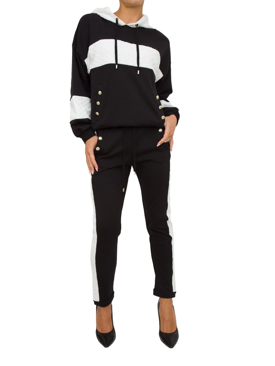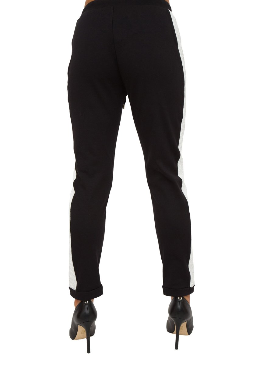 Pantaloni jogging da donna Liu-Jo realizzati in jersey di cotone stretch, dettagli in maglia, cintone elastico con coulisse in vita, tasche sui fianchi con bottoni e risvolto al fondo.