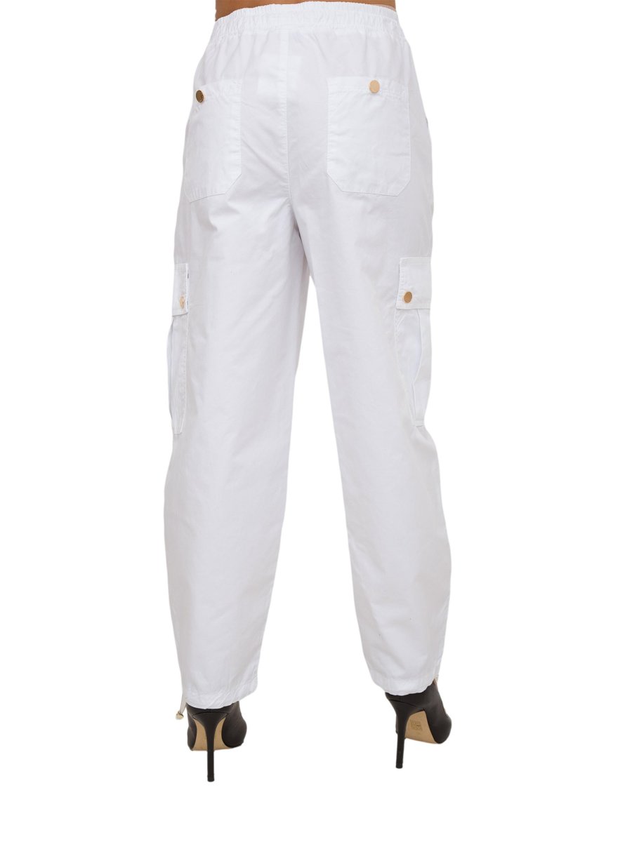 Pantaloni cargo in cotone, vita regolare con elastico e coulisse, tasconi laterali, e con fondo stretto.