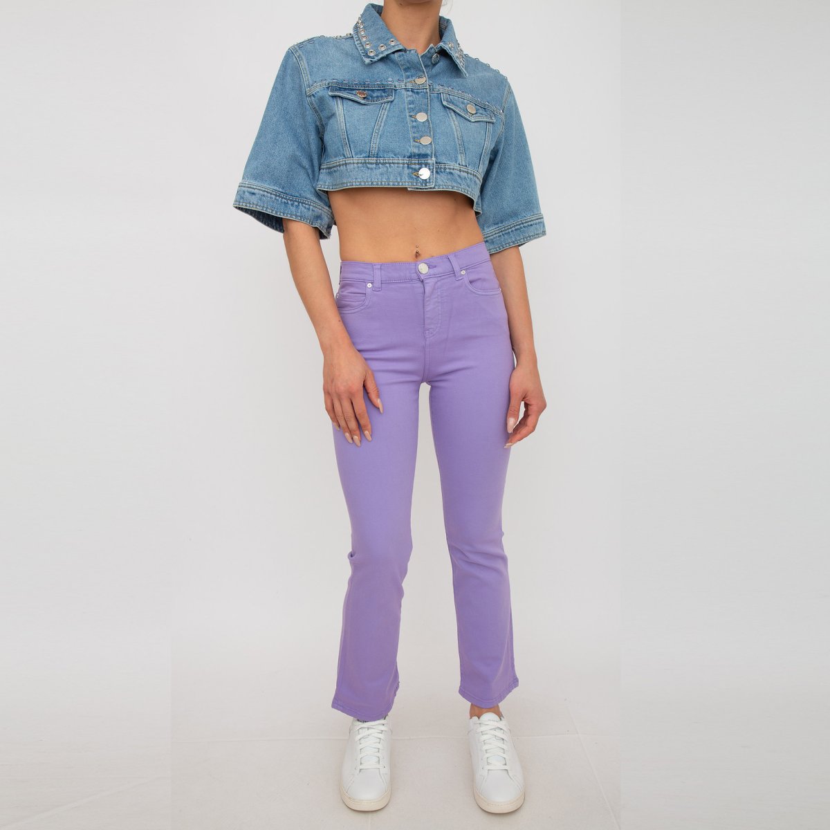 Jeans cinque tasche bootcut flare-fit in bull di misto cotone lyocell power stretch colorato. Vita regular, gamba dalla linea slim, leggermente svasata al fondo, e lunghezza alla caviglia. Chiusura con zip e bottone a chiodo in metallo.