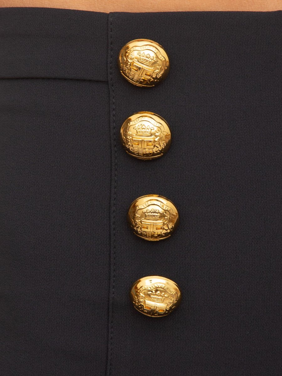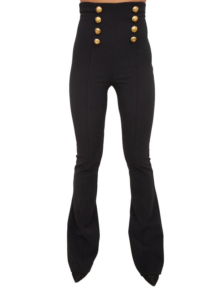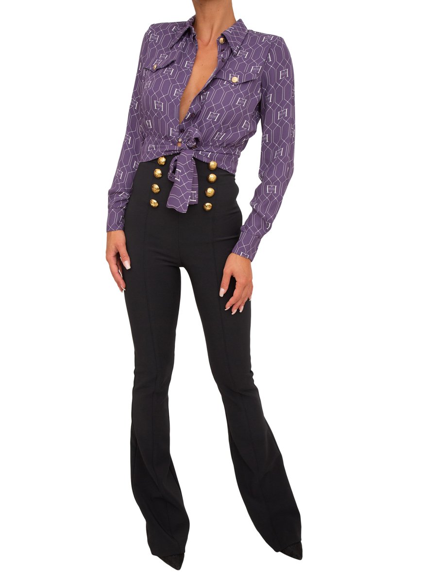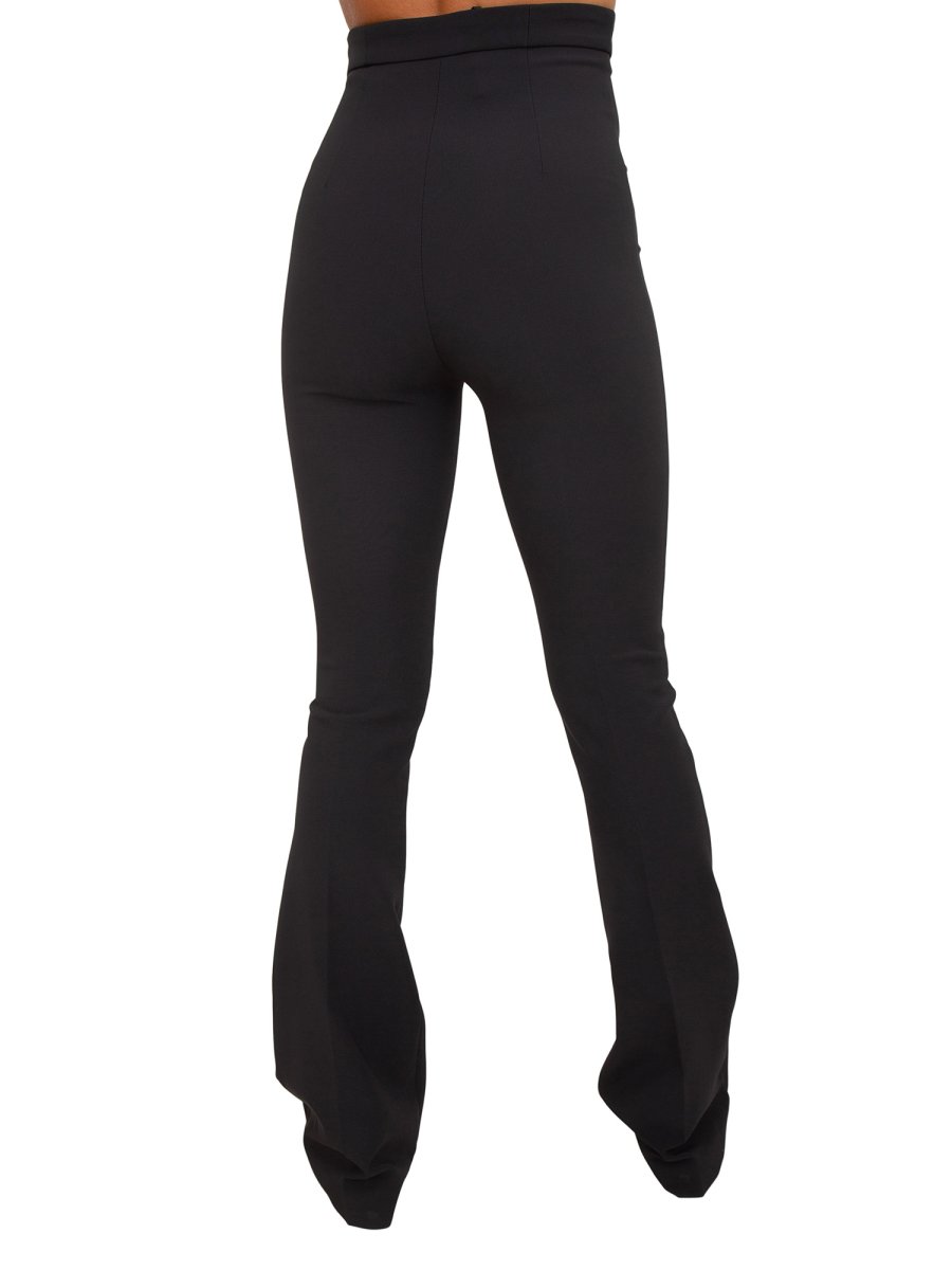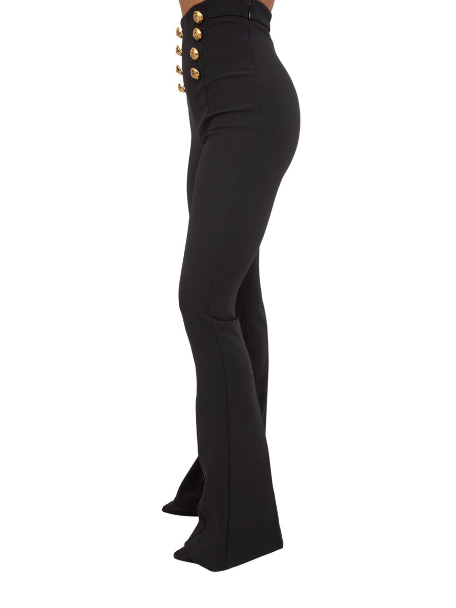 Pantalone zampa Elisabetta Franchi a vita alta in doppio crêpe stretch con tasche nei fianchi e decoro di bottoni a calotta in metallo dorato.