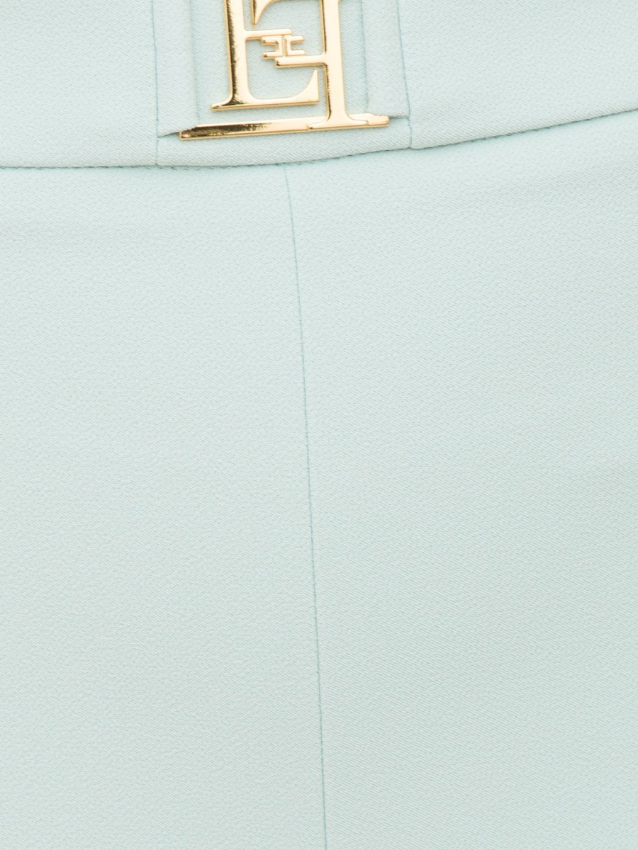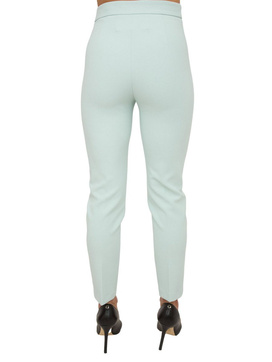 Pantalone dritto in doppio crêpe stretch. È caratterizzato da fascione impreziosito da passante logo in metallo dorato.