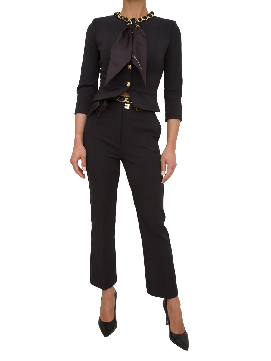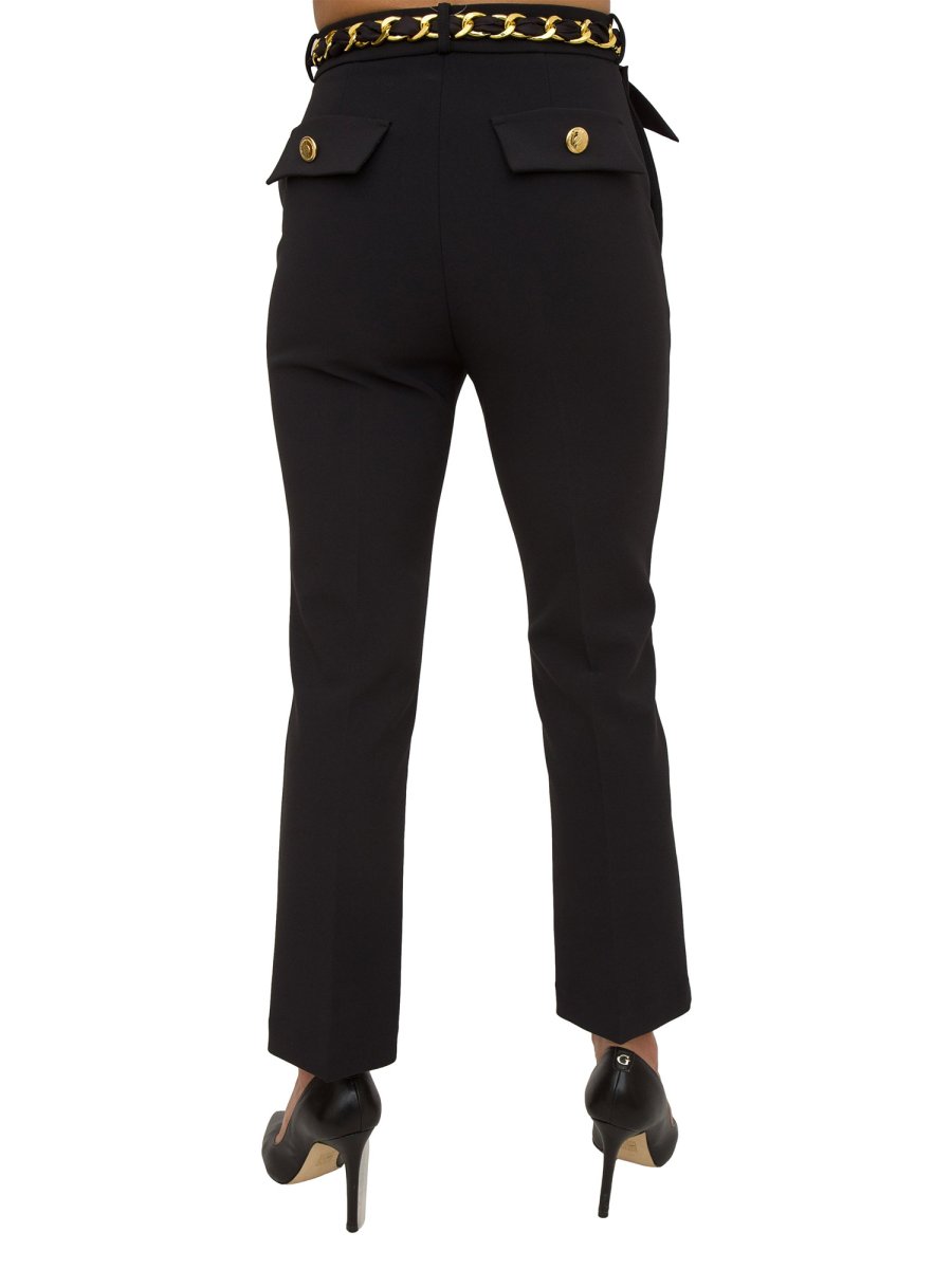 Pantalone alla caviglia in doppio crêpe stretch leggermente svasato. Il punto vita è enfatizzato dall'applicazione di un accessorio in catena e foulard infilato.