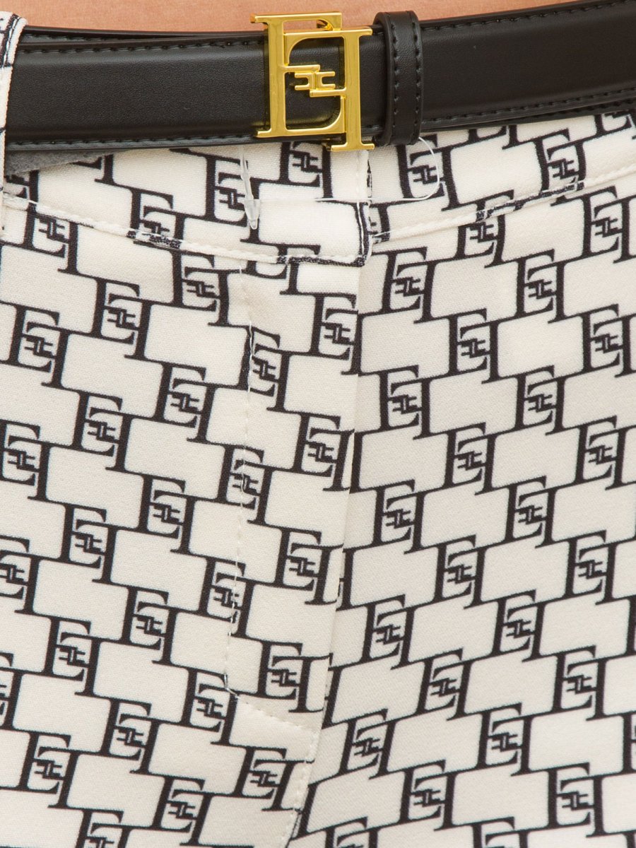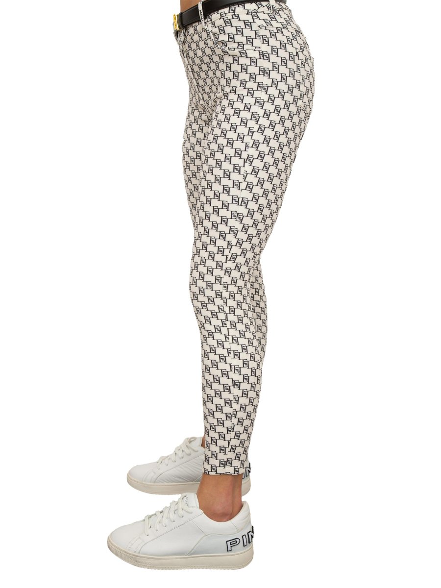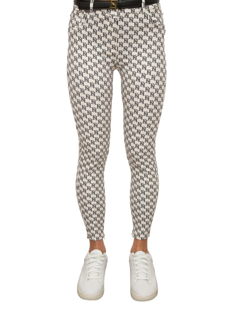 Pantalone 5 tasche in doppio crêpe stretch stampa logo a vita regular. È caratterizzato da cintura con fibbia logo in metallo dorato.