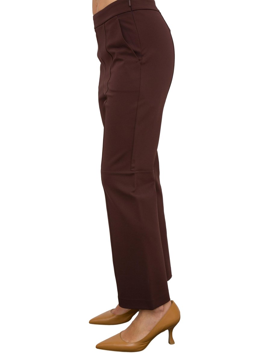 Pantalone in morbido jersey di viscosa con lavorato a punto Milano, con cintone piatto in vita. La linea flair leggermente svasata al fondo è impreziosita dal gioco di nervature sul davanti e dai tagli laterali all’altezza del ginocchio. Chiusura con zip nascosta sul fianco.