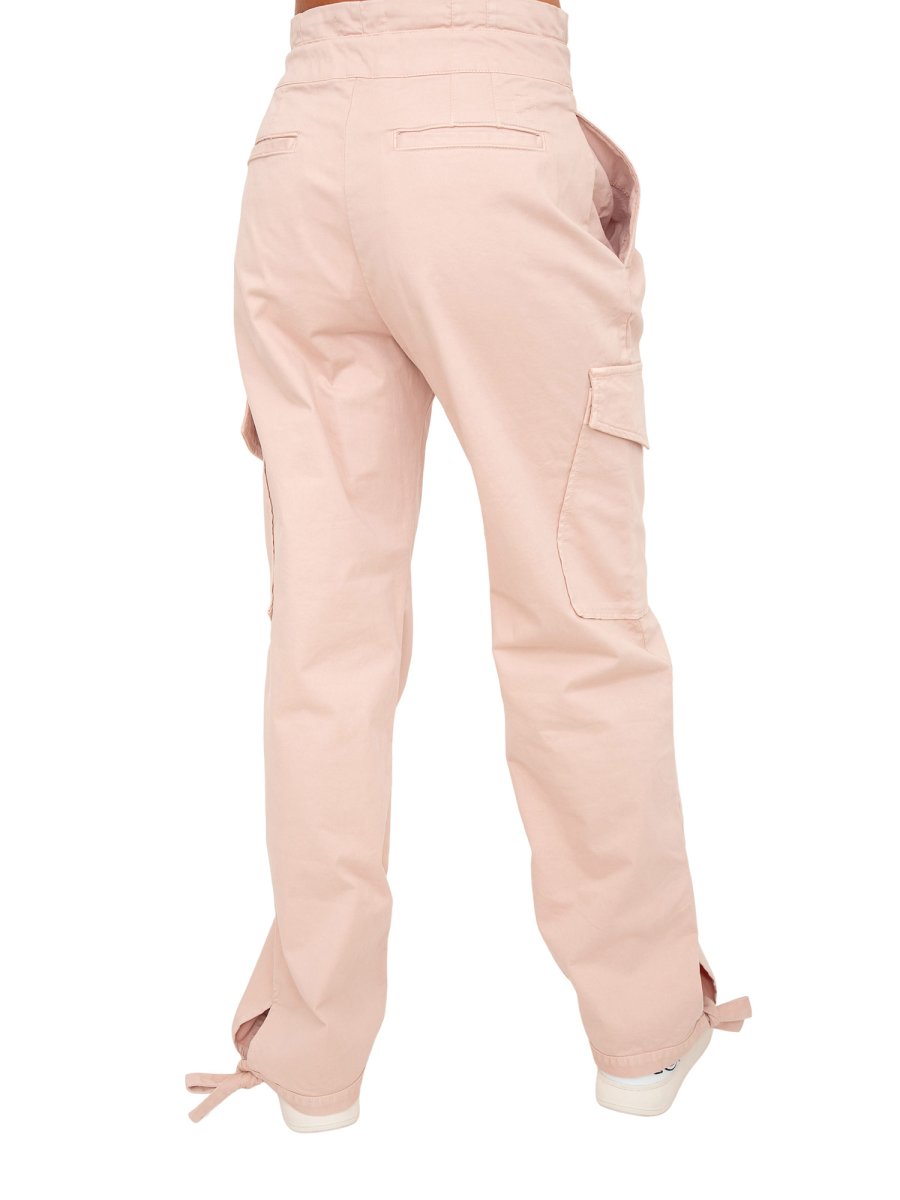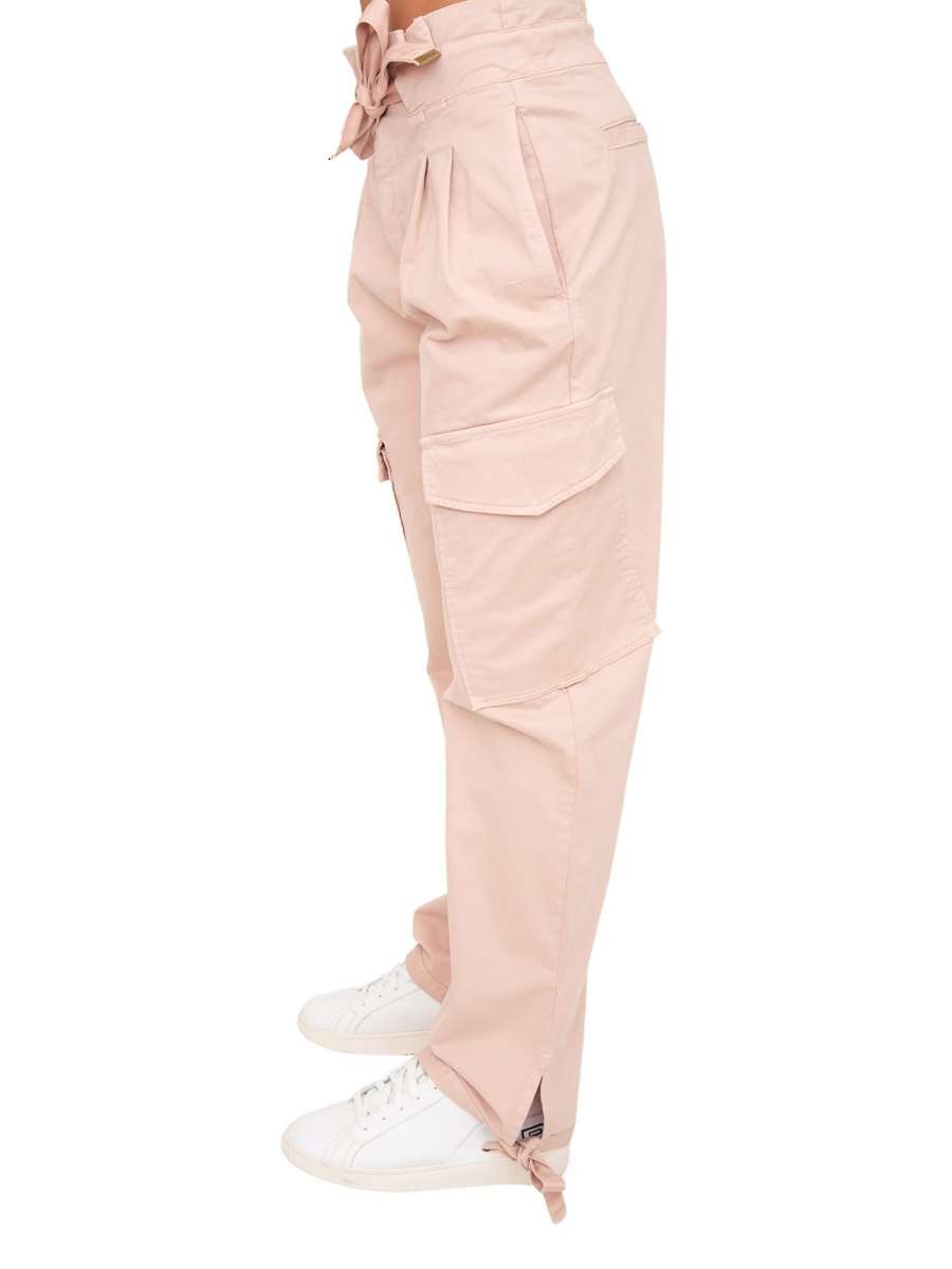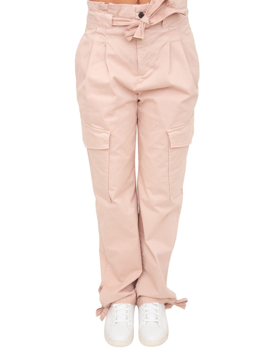 Pantaloni cargo Pinko in raso di cotone stretch. Vita alta con pences e cintura inserita, nello stesso tessuto, da annodare. Gamba dalla linea dritta con tasche a filetto sia davanti che sul retro e maxi tasche a soffietto in stile utility laterali, coulisse a fondo capo, da annodare per personalizzare la portata del capo. Chiusura con zip e bottone davanti.