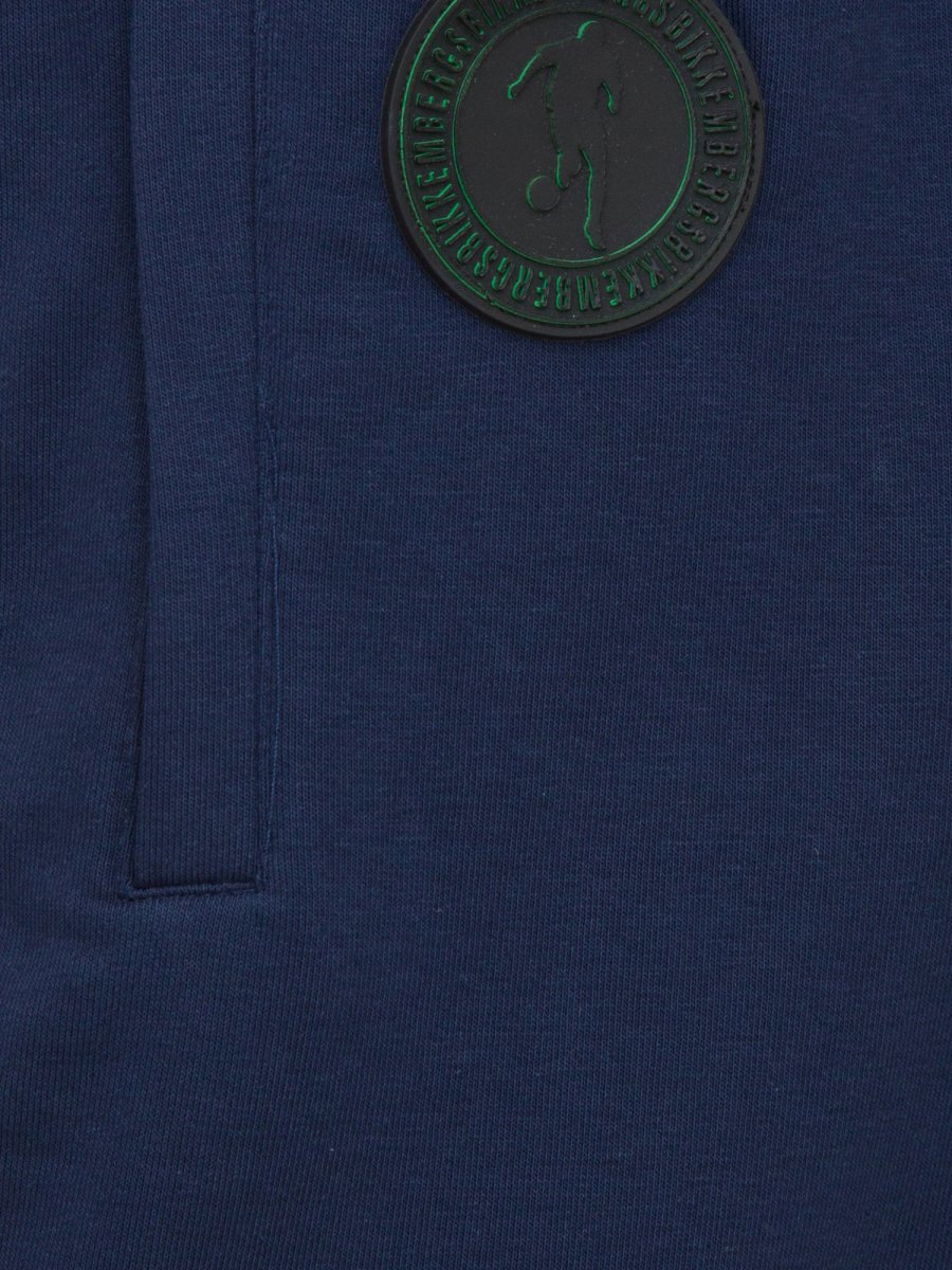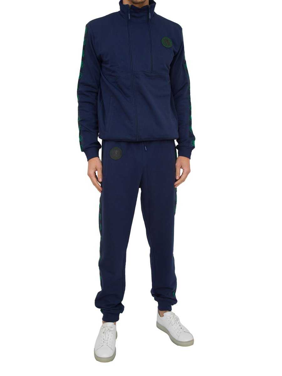 Pantaloni da tuta maschile in felpa stretch sono dotati di coulisse in vita, due tasche con cerniera e una tasca posteriore a filetto. Caratterizzati dall'immagine dell'iconico giocatore di calcio Bikkembergs posizionata a ripetizione lungo le gambe.