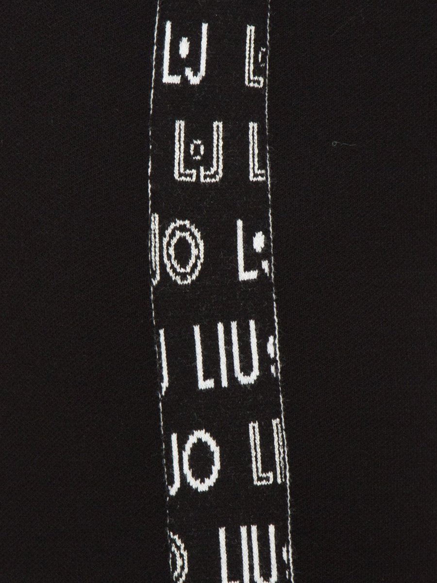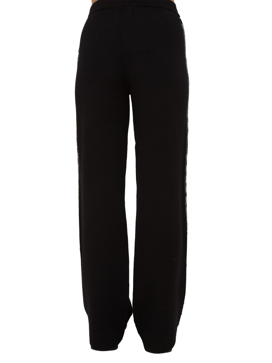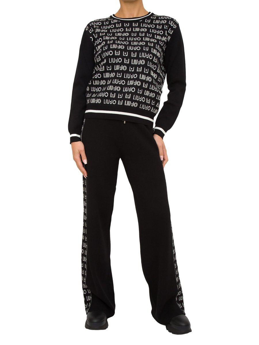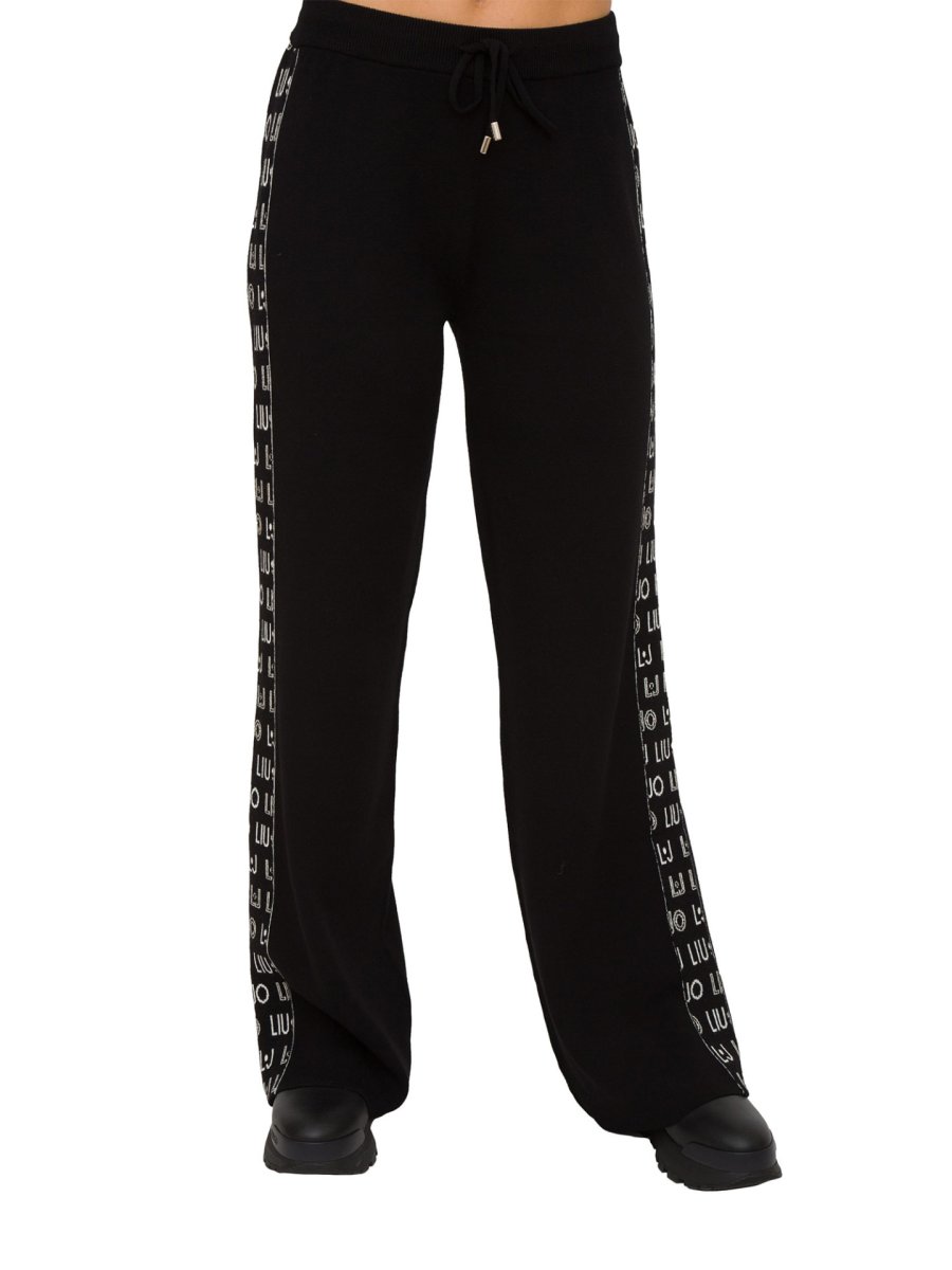 Pantalone da donna in maglia Liu-Jo realizzati in misto viscosa, modello palazzo, banda decorativa laterale con logo monogram LJ e fascia elastica in vita con coulisse.