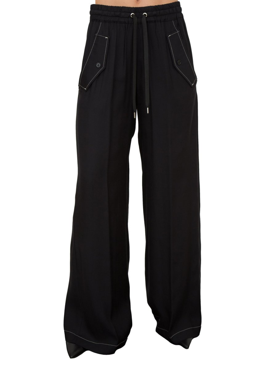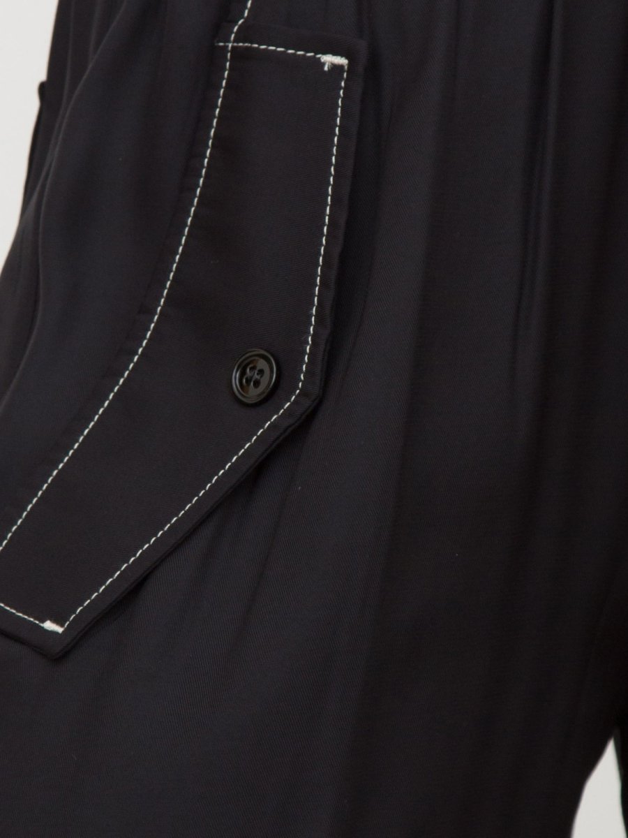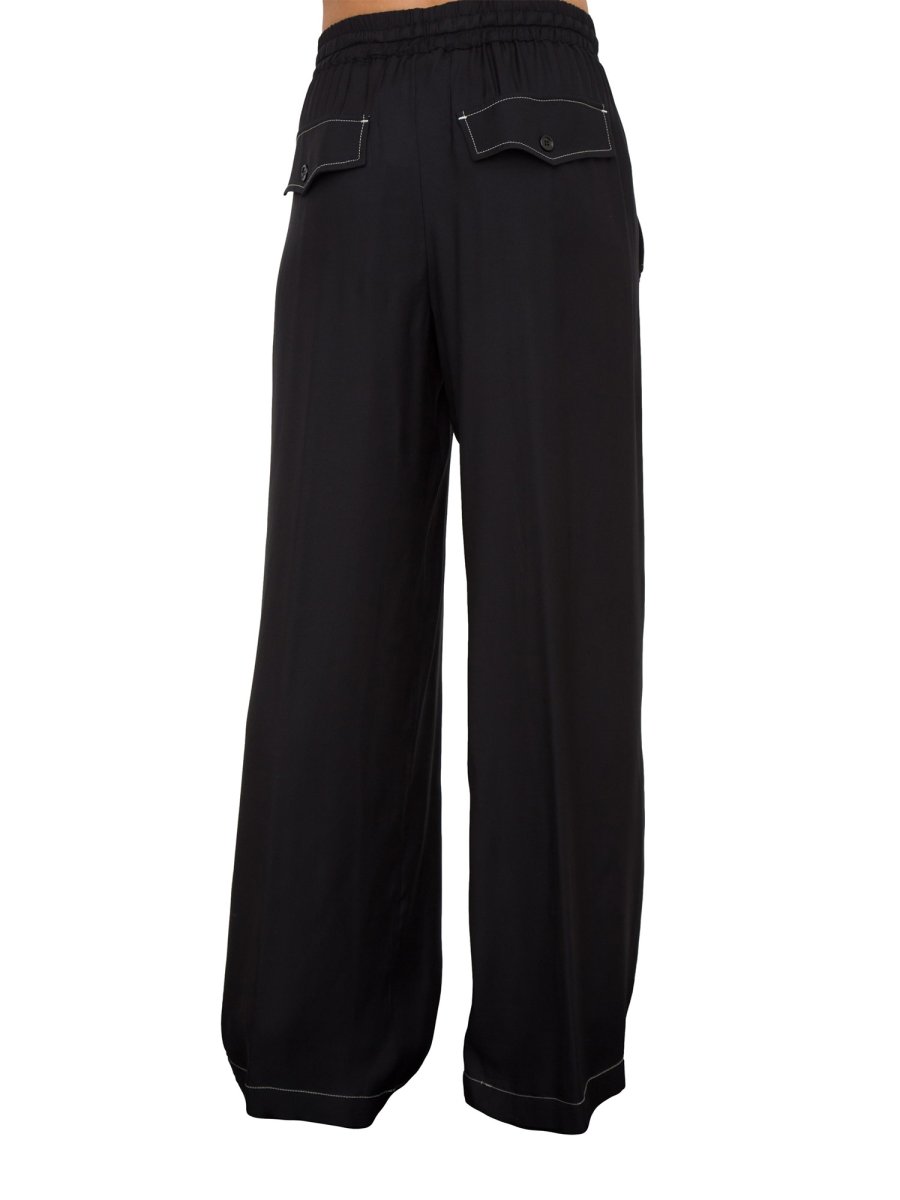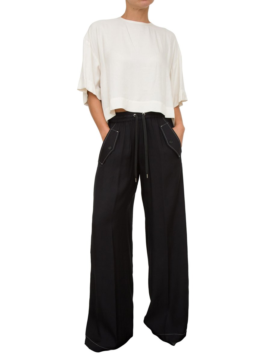 Pantaloni wide leg in twill di viscosa con impunture a contrasto. Vita alta con elastico e coulisse da annodare e gamba dalla linea dritta e ampia, con tasche alla francese con patta aggiunta sui fianchi e tasche chiuse con patta e bottone sul retro.