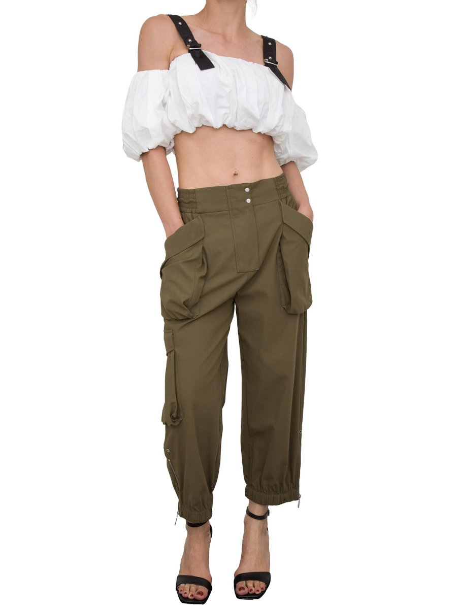 Женские брюки карго Pinko из легкой, струящейся хлопковой ткани, которая скользит по силуэту, подчеркивая покрой морковки, более мягкий на бедрах и более узкий в нижней части штанины. Модель дополнена макси-карманами по бокам и большим карманом-книжкой на одной штанине, а длинный покрой на щиколотке дополнен резинкой и молнией в нижней части изделия. Идеально подходит для создания повседневного образа с особой утилитарной изюминкой.