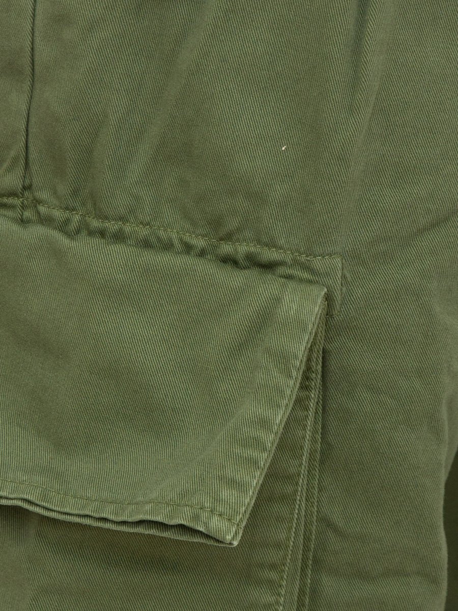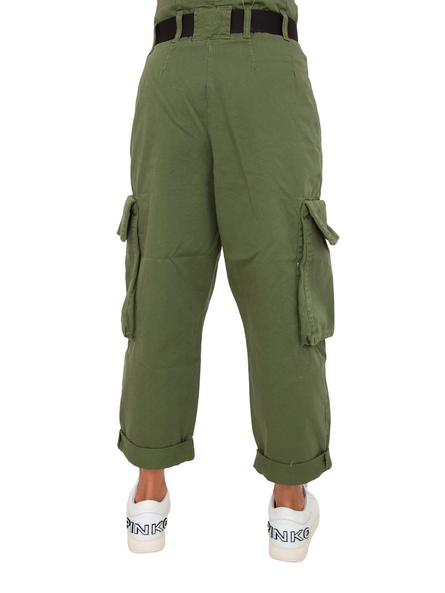 Pantaloni cargo Pinko dalla linea ampia in gabardina di cotone tinta in capo. Vita completa di passanti per cintura e cintura abbinata in nastro con finalini in metallo. Gamba dalla linea dritta con tasche con patta a punta sui fianchi, tasconi laterali a soffietto e risvolto al fondo. Chiusura con zip e bottone.