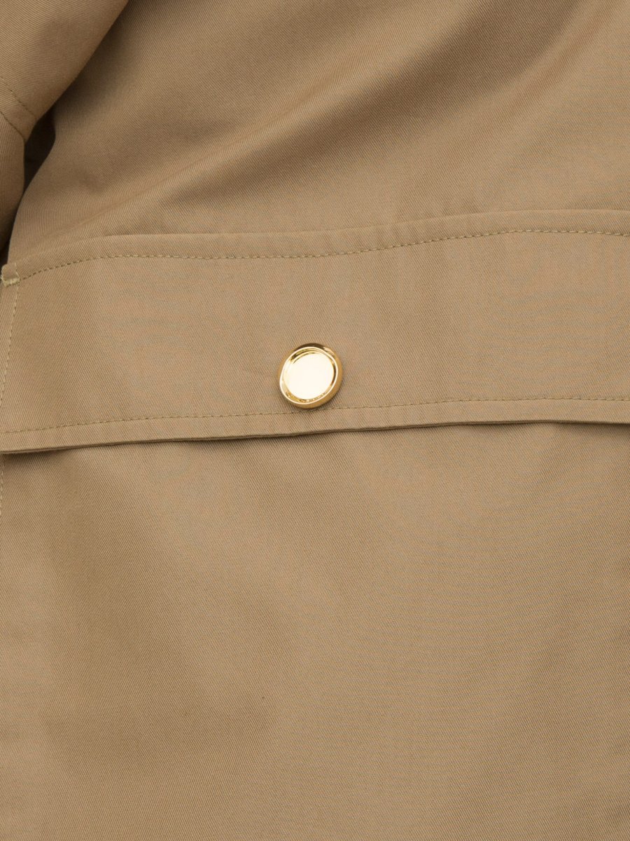 Parka corto in gabardina di misto cotone. Colletto a camicia, alamari con bottone sulle spalle e a fondo manica, tasche a toppa applicate con patta e bottone. Dettagli di coulisse al fondo per personalizzare la portata del capo. La chiusura è completata da patta chiusa da due bottoni in metallo.