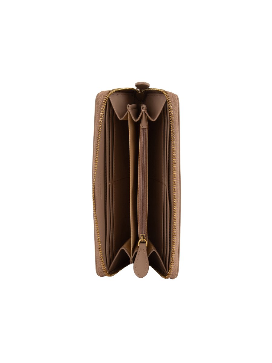 Portafoglio Pinko zip-around in morbida pelle mano seta, personalizzato con placchetta Love Birds Diamond Cut su base in pelle. L'interno è foderato in polycotton ed è diviso in quattro scomparti, di cui uno chiuso con zip e due con spazi per carte di credito.