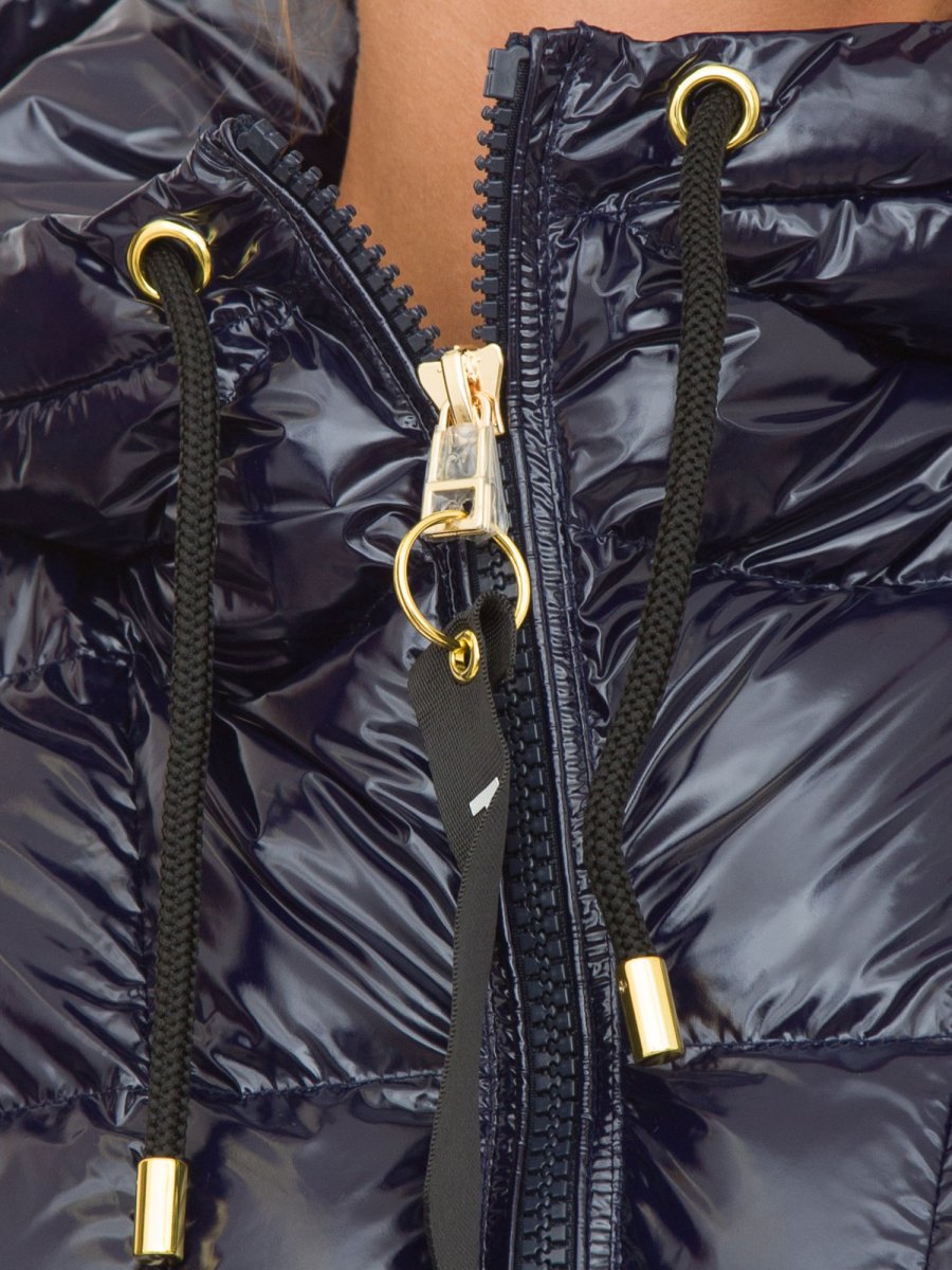 Утепленный пуховик силуэта бушлат из нейлоновой ткани с кристаллами и особенной блестящей отделкой. Воротник с капюшоном, шнурком с металлическим наконечником, длинными рукавами и вертикальными прорезными карманами по бокам. На подкладке. Металлическая застежка-молния спереди, двойной бегунок, один из которых украшен лентой с логотипом.