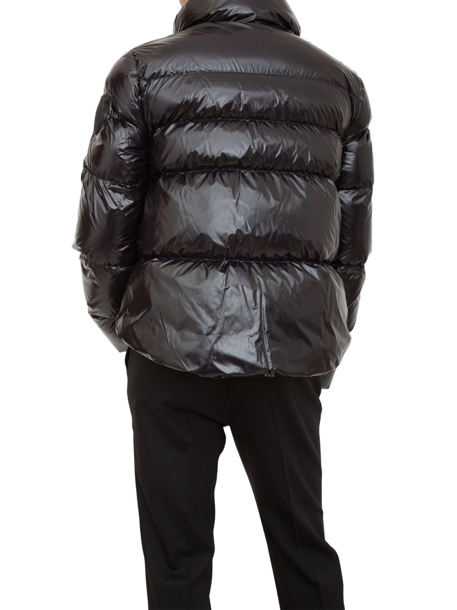 Утепленный пуховик силуэта бушлат из нейлона с кристаллами и особенной блестящей отделкой, украшенный нашивкой с логотипом Love Birds на одном рукаве. Высокий воротник, застегивающийся на кнопки спереди, длинные рукава и вертикальные прорезные карманы по бокам. На подкладке из технической ткани. Застежка-молния с лентой- логотипом.