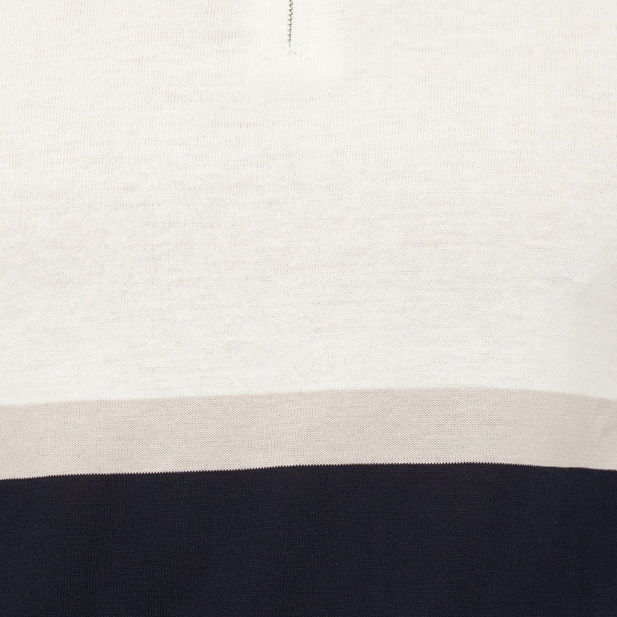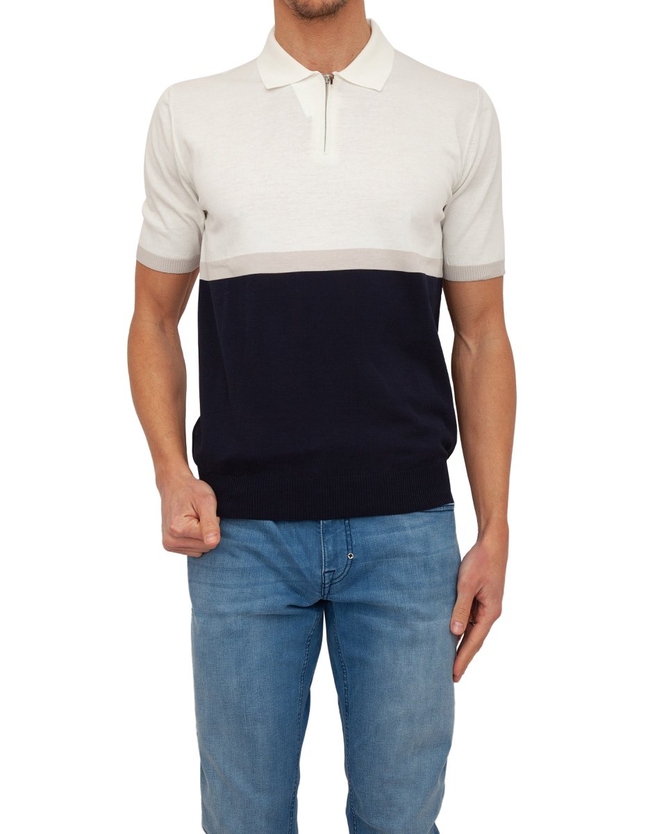 Polo a maniche corte in cotone, design monocromo, dettaglio a righe, colletto alla francese, chiusura frontale con zip corta e maniche corte.