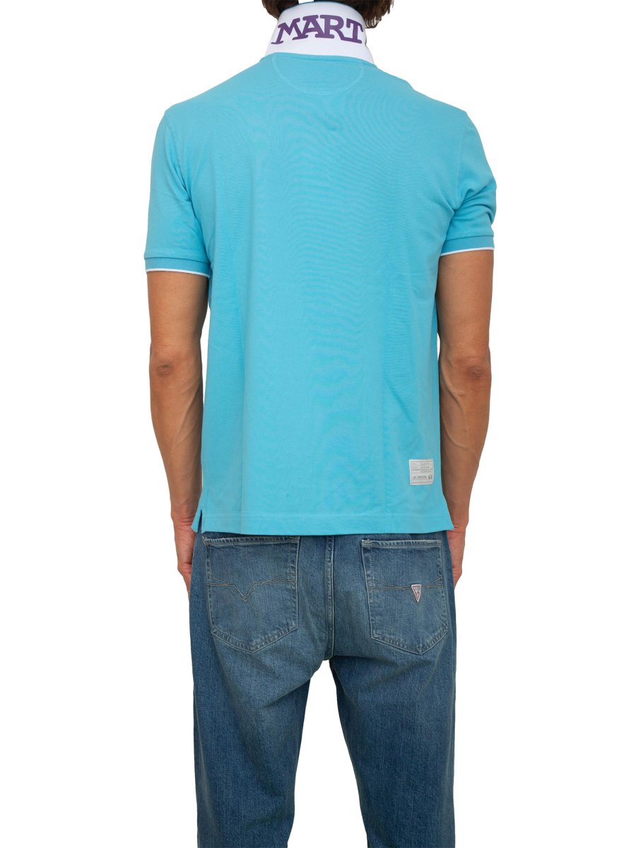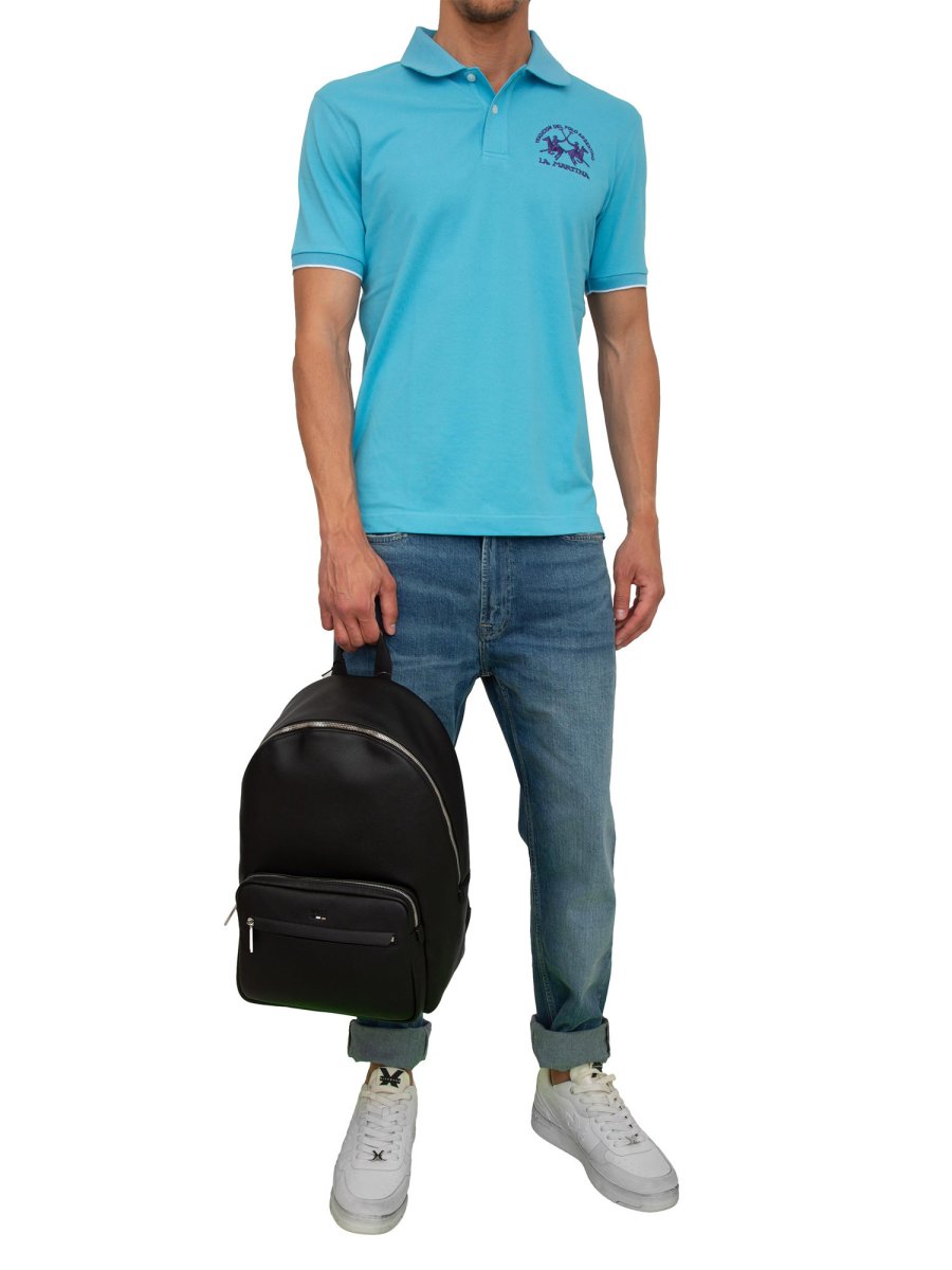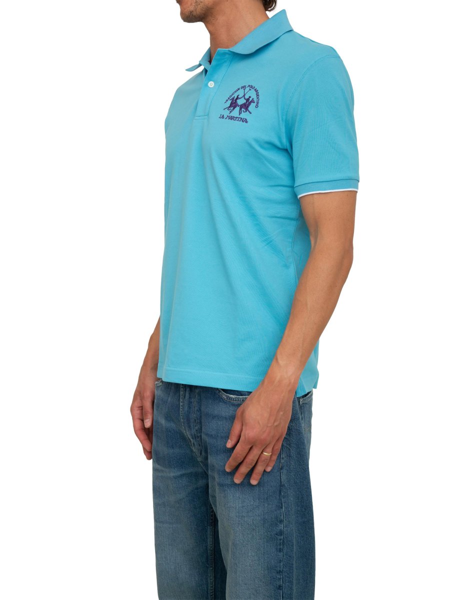 Polo uomo La Martina a maniche corte in tinta unita, realizzata in piquet stretch con vestibilità regular. Chiusura a due bottoni e nastro a contrasto applicato sull'interno collo. Il collo e i polsini sono in costina in tono. Grande logo ricamato sul petto e sotto collo con stampa scritta La Martina a contrasto. Il modello è alto 1.90m e indossa la taglia L.